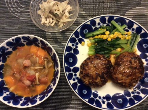 きのこ入りハンバーグ小松菜とコーンのバターソテーごぼうとチキンのごまマヨサラダ ***************** 野菜スープ