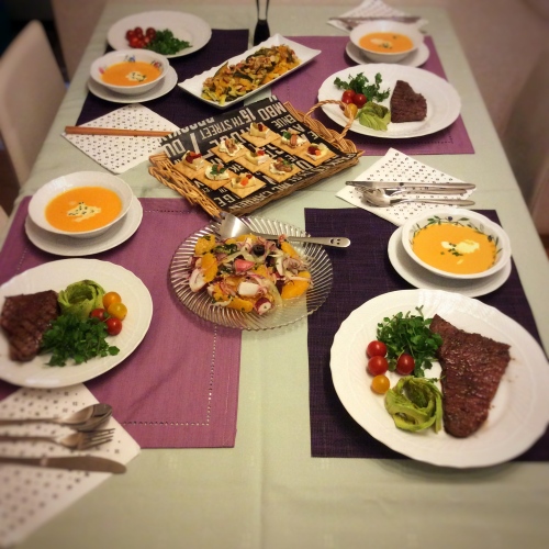 和牛ステーキアボカドローズプチトマトクレソン海老のビスクたことオレンジ、ブラックオリーブのマリネクラッカー&チーズ、ナッツ、ドライフルーツかぼちゃとズッキーニのマリネ 今回、海老のビスクに初挑戦。海老の殻でダシをとり、トマトと牛乳、生クリームで仕上げます。 今回のお料理で一番苦戦したのがコチラのアボカドローズ アボカドをカットして薔薇のように見せる・・・というものなんですが、四苦八苦 ******************* 今日は池袋で息子の予備校の保護者会だったので、帰りにデパ地下でお肉を調達してきました。 都内のデパ地下は誘惑が多くて、なかなか帰宅できず^^;