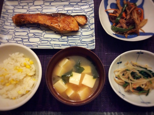 ぶりのカレー照り焼き牛ごぼうきんぴらほうれん草ともやしの食べラー和えとうもろこしご飯お豆腐とわかめのお味噌汁 **************