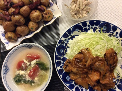 ポークチャップレタスとトマトのスープ新ジャガとベーコンのガーリック醤油バター炒めごぼうのサラダ ****************** 夫の実家の家庭菜園で作った新ジャガです。ころころとした可愛いサイズだったので、そのままのカタチを活かしました。