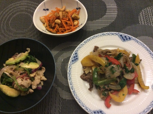 牛肉とパプリカのカレーソテー豚しゃぶとアボカドのサラダにんじんのナッツきんぴら *******************