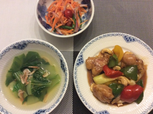 鶏肉とカシューナッツのオイスター炒め青梗菜と桜海老のスープにんじんとピーナッツのタイ風サラダ ******************* 牛肉巻きおにぎりパプリカの塩昆布炒めごぼうサラダ小松菜と卵のマヨ炒め ****************** 試験本番の日の息子弁当。食べるのが遅い子なので、おにぎりにしました。