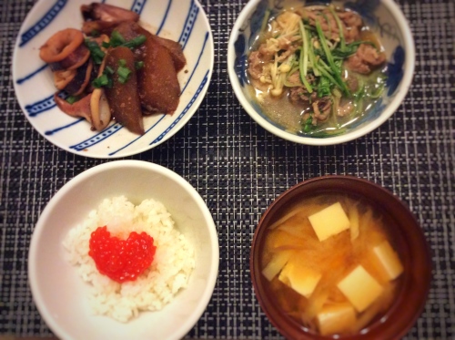 いかと大根のわた煮水菜と牛肉の煮浸しお豆腐とみょうがのお味噌汁いくらごはん *******************