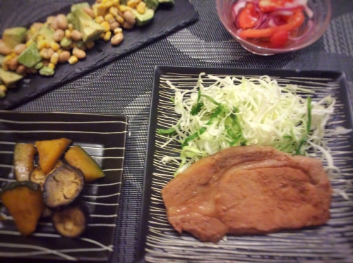 豚肉のはちみつ味噌付け焼きしそ入りキャベツの千切りなすとかぼちゃの蒸し炒め大豆とコーン、枝豆とアボカドのサラダトマトと紫玉ねぎの甘酢漬け **************