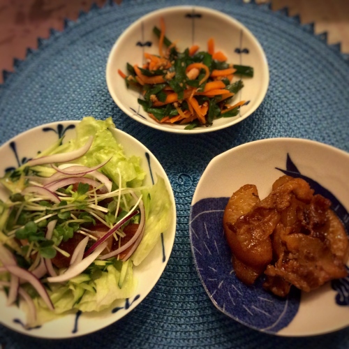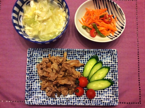 豚肉の甘辛炒めにんじんのタイ風サラダレタススープ ************ 母子三人のお昼ごはん。ツナと水菜のパスタです♪ ***************