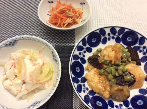 鶏むね肉となすのスイートチリ炒め白菜とカニかま、お豆腐の煮物にんじんとえのきの中華和え *************