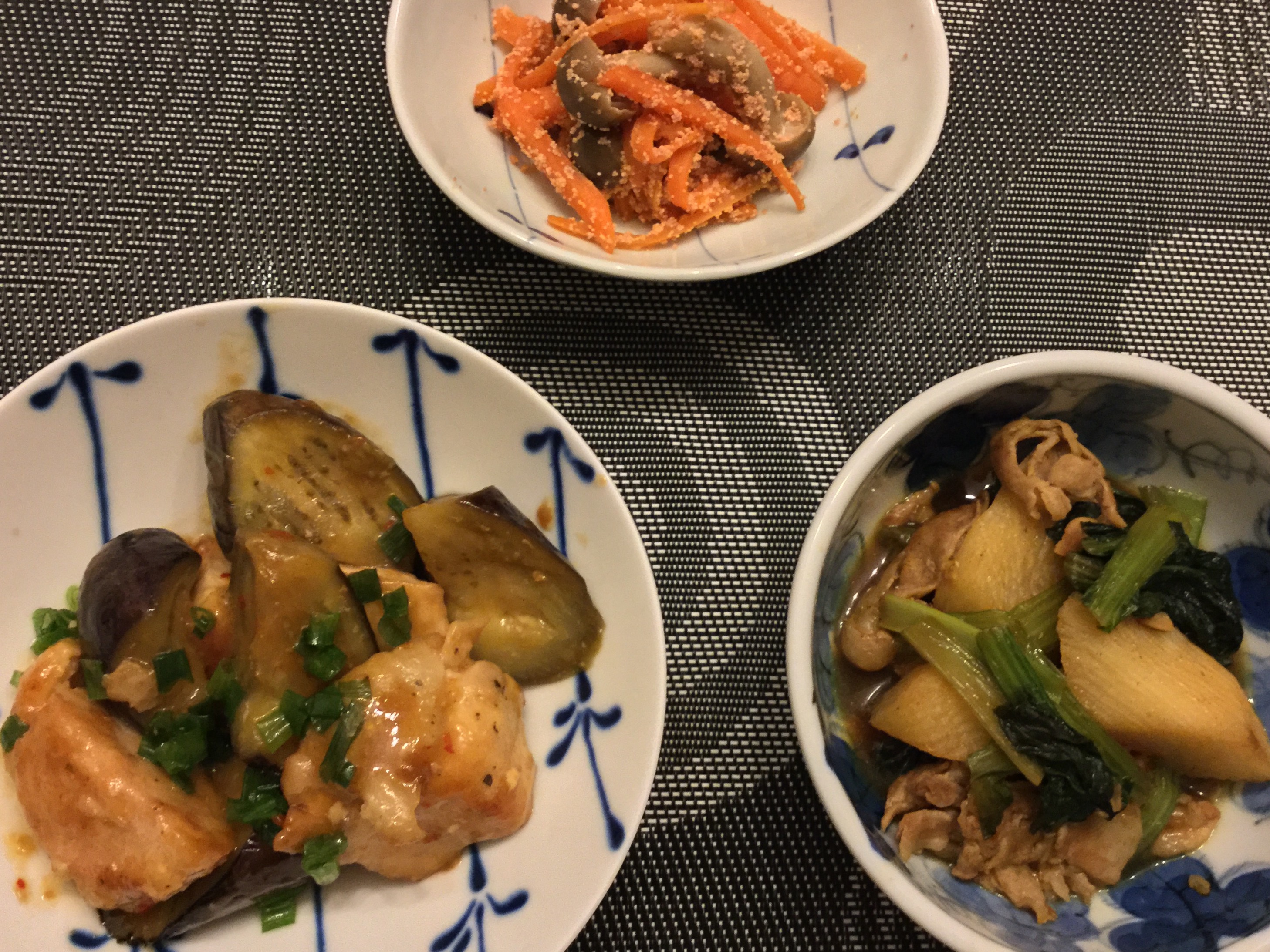 鶏むね肉となすのスイートチリソース炒め長芋と小松菜のカレー煮にんじんとしめじのたらこ炒め*********************