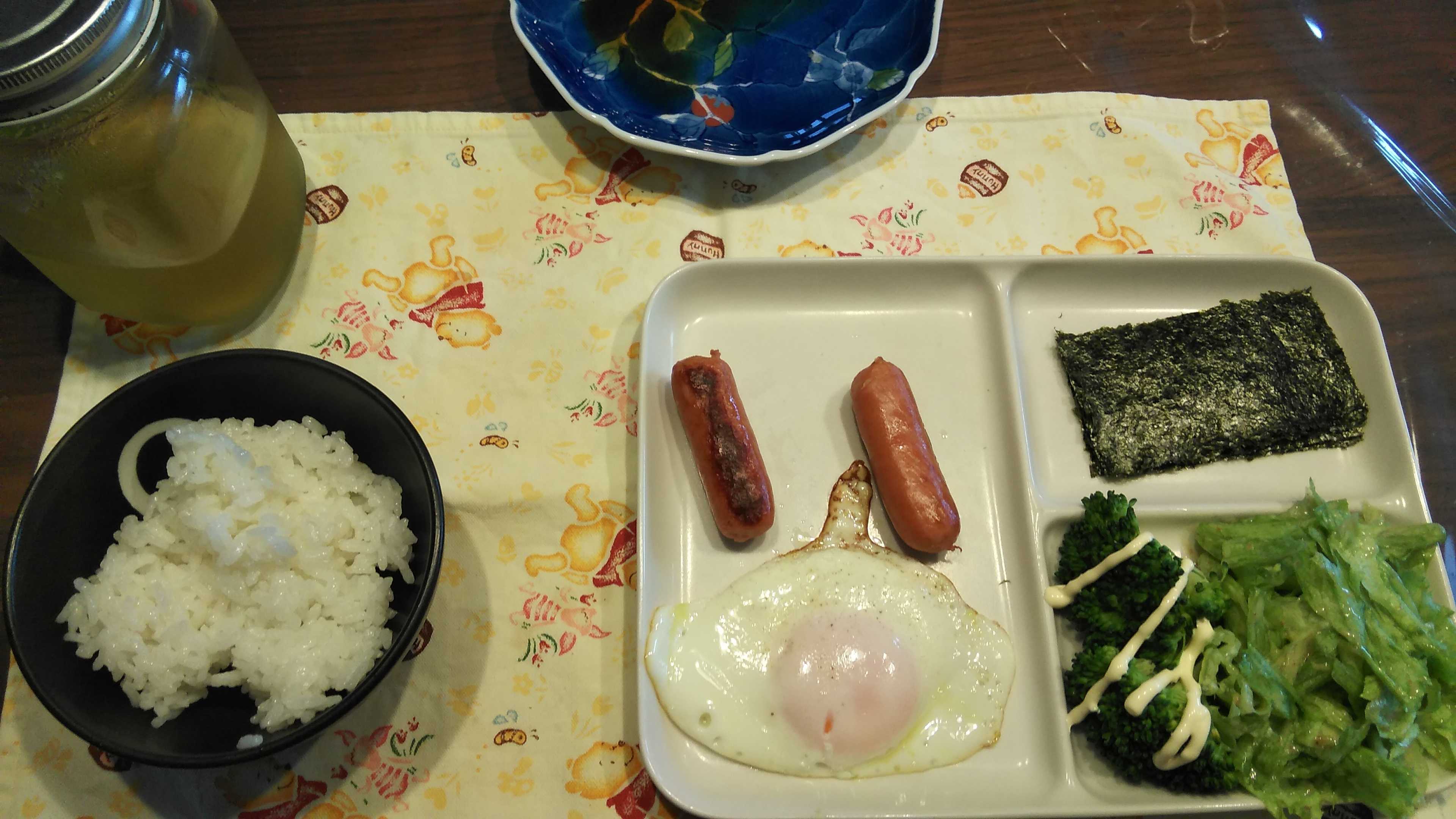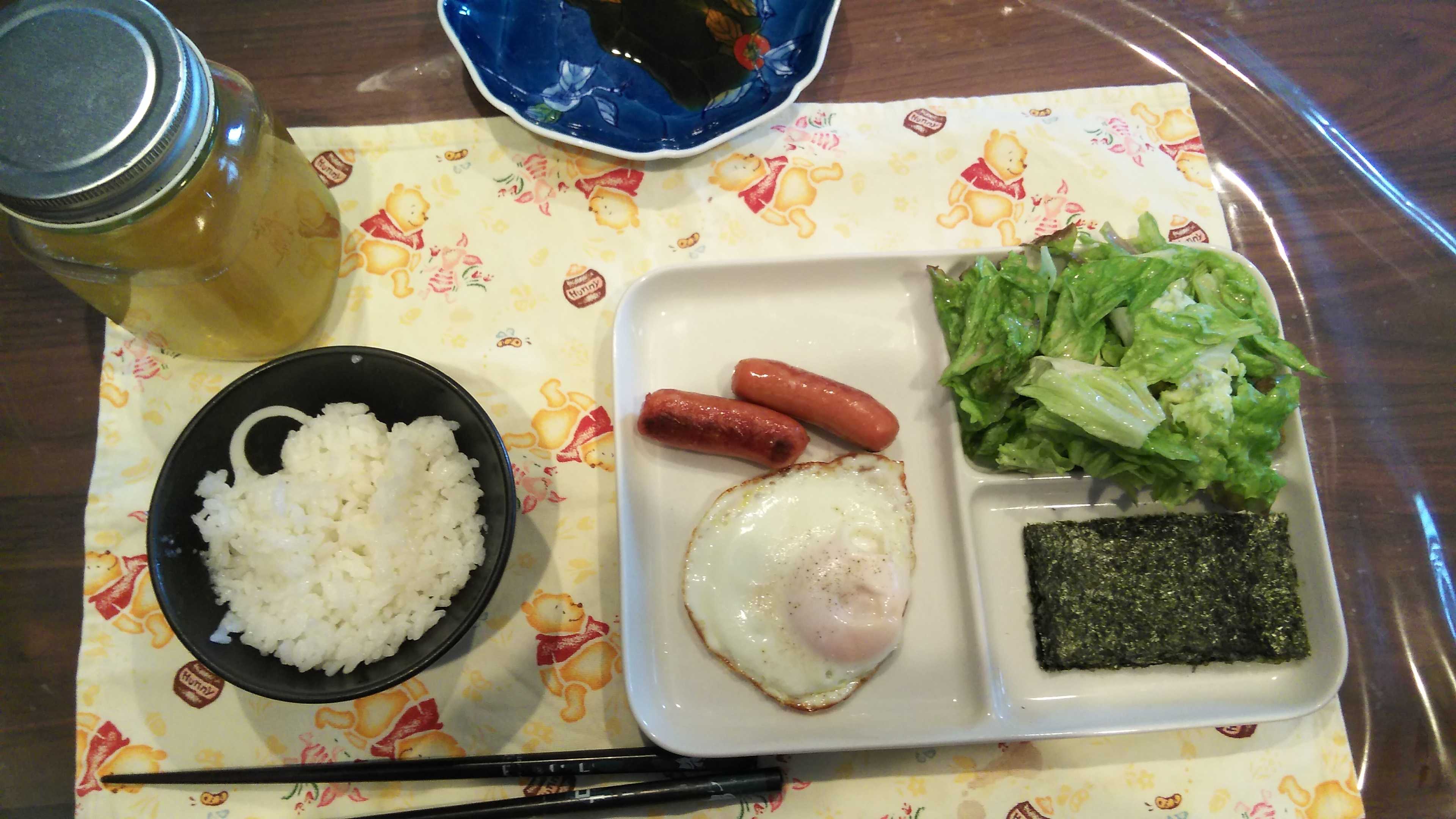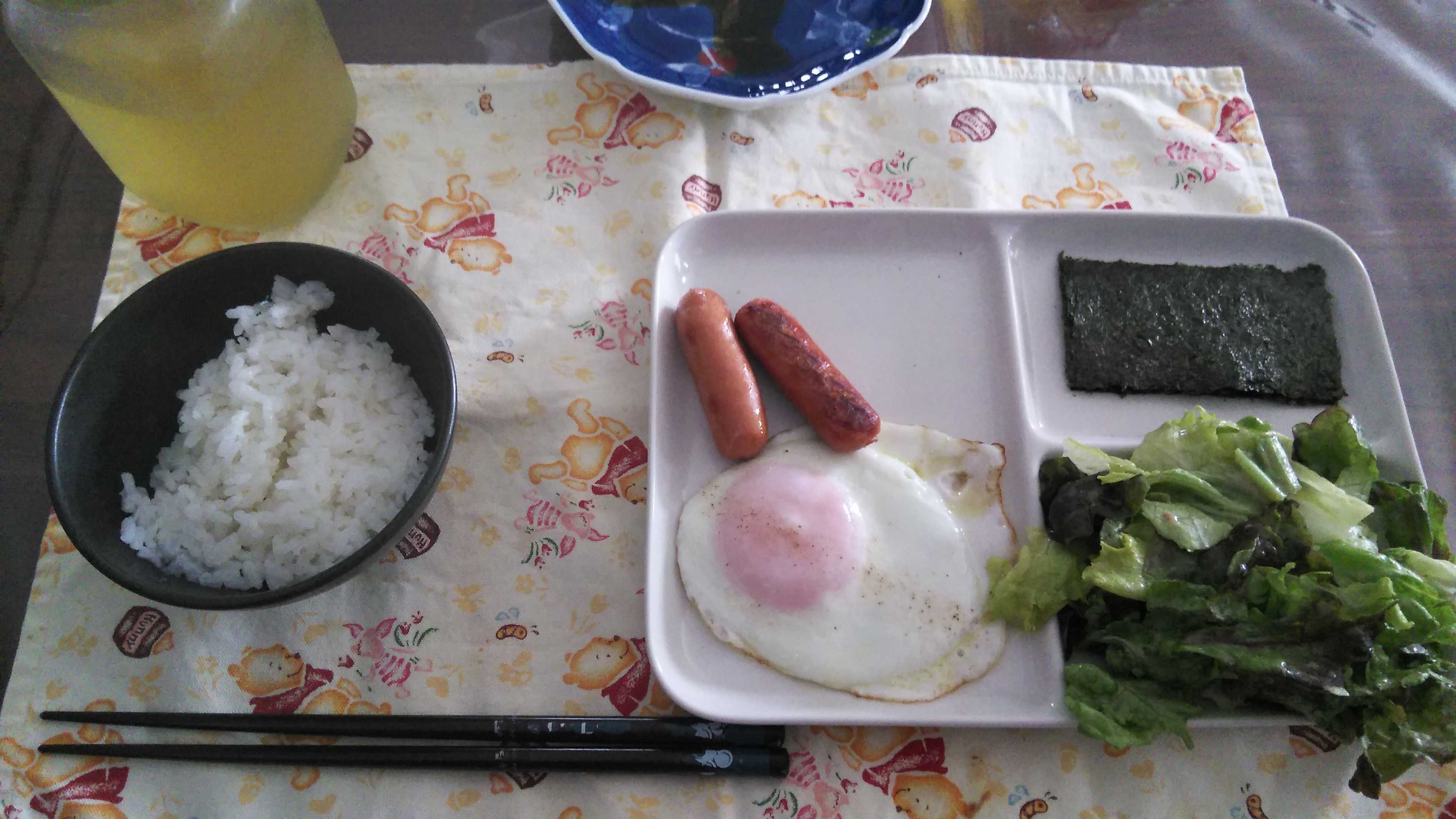 朝食→サラダ、ウィンナー2本、目玉焼き、焼きのり、ご飯、お茶朝食後→カフェオレ昼食→サラダ、イチゴジャムヨーグルト、チーズハムトースト、豆乳ココア夕食→トマト、サラダ、ニラ卵焼き、豚肉のごまごま焼き、かぼちゃの味噌汁、ご飯、お茶夕食後→コーヒー