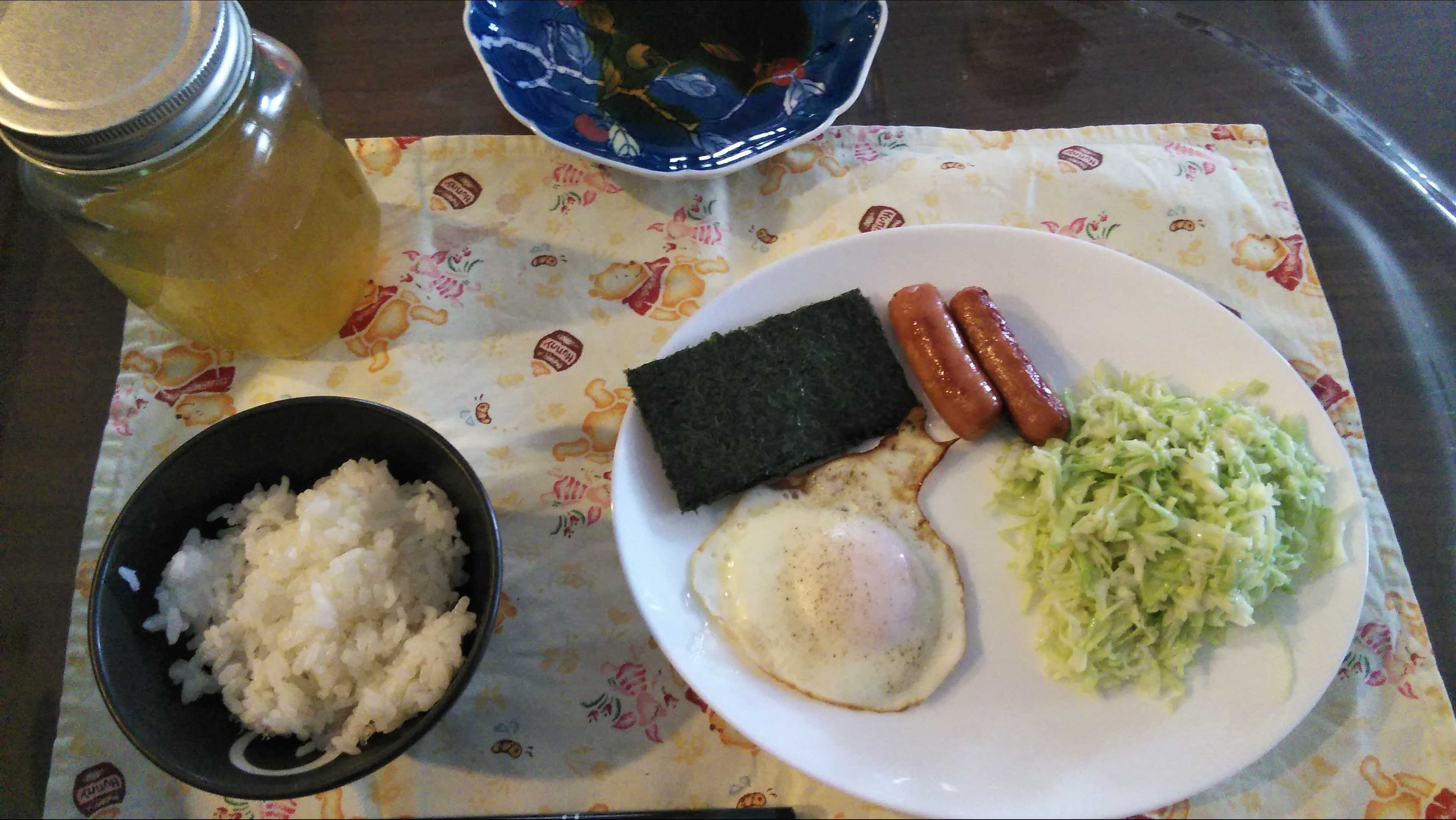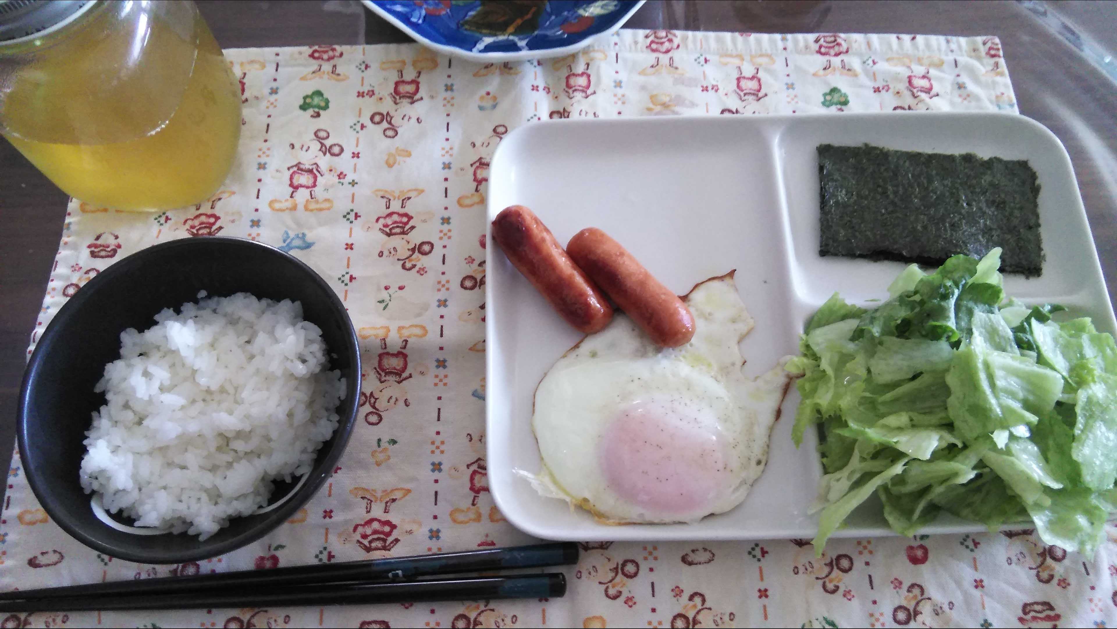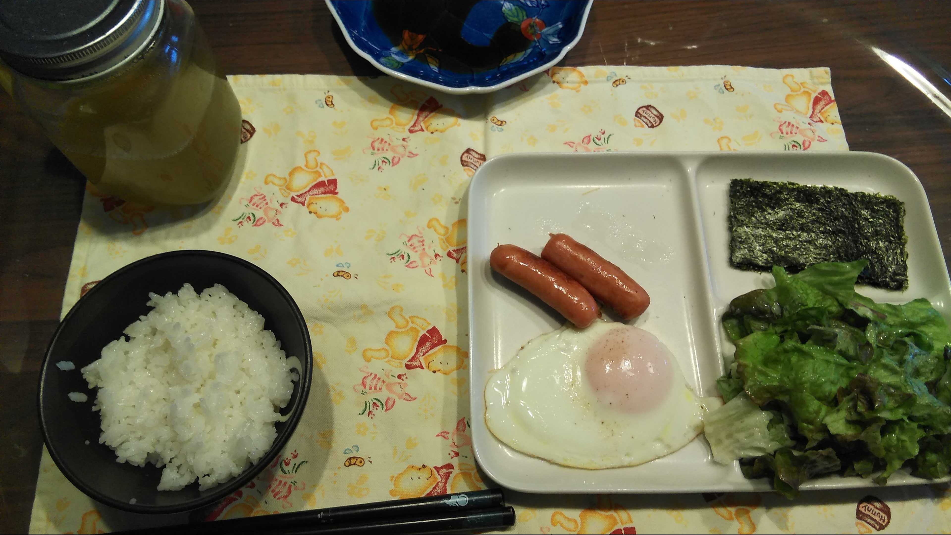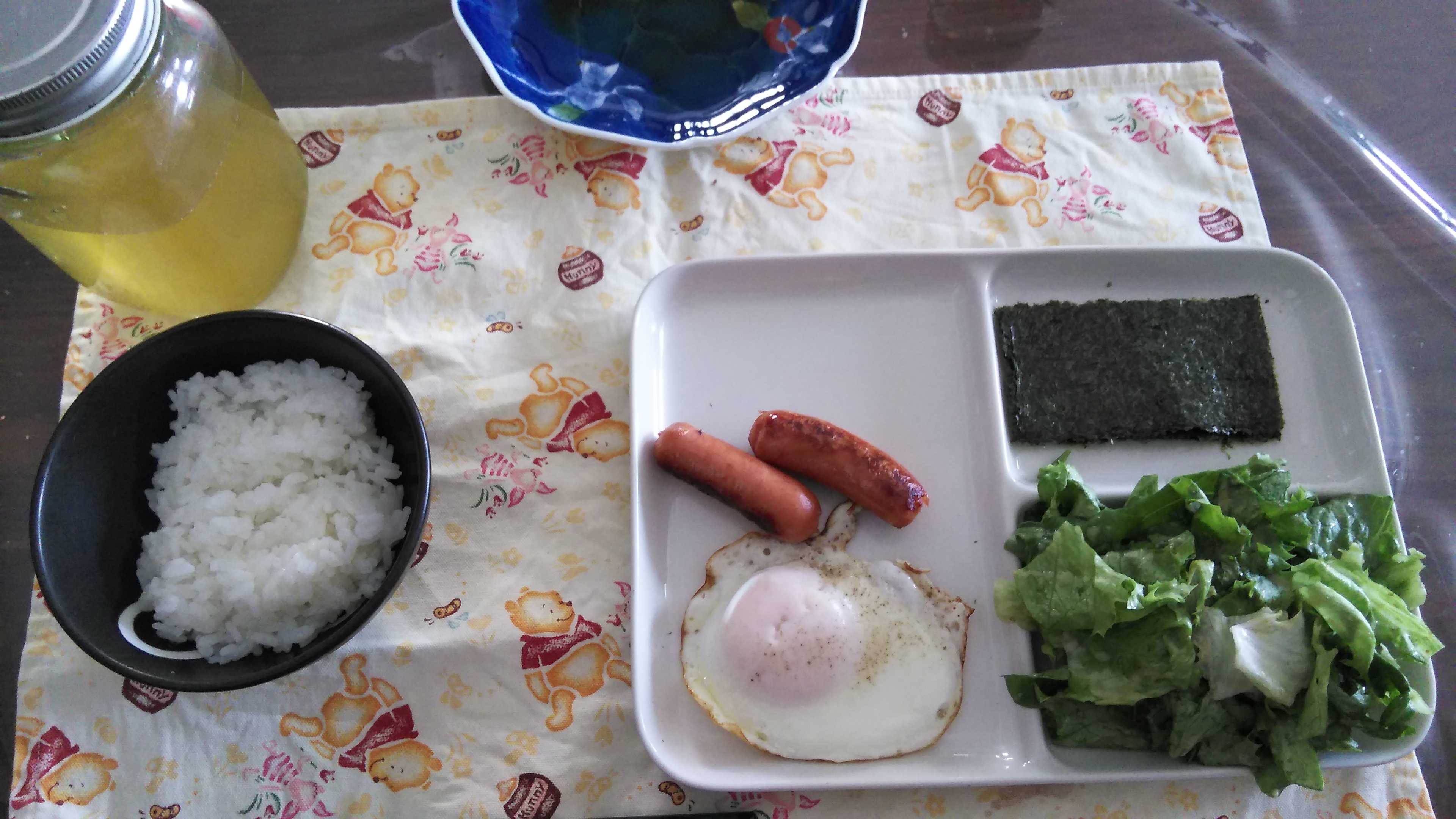 朝食→サラダ、ウィンナー2本、目玉焼き、焼きのり、ご飯、お茶朝食後→カフェオレ昼食→サラダ、イチゴジャムヨーグルト、チーズハムトースト、豆乳ココア夕食→トマト、サラダ、ニラ卵焼き、豚肉のごまごま焼き、かぼちゃの味噌汁、ご飯、お茶夕食後→コーヒー