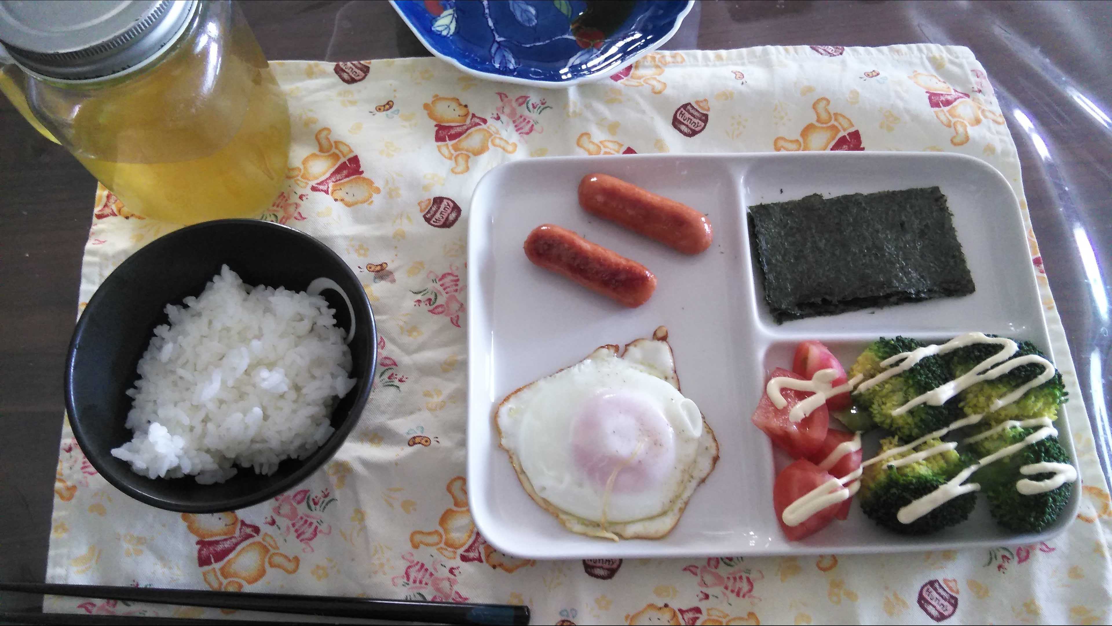 朝食→トマト、サラダ、ウィンナー2本、目玉焼き、焼きのり、ご飯、お茶朝食後→カフェオレ昼食→サラダ、イチゴジャムヨーグルト、チーズハムトースト、豆乳ココア夕食→トマト、ブロッコリーサラダ、豆苗の卵とじ、塩サバ、キャベツの味噌汁、ご飯、お茶夕食後→コーヒー