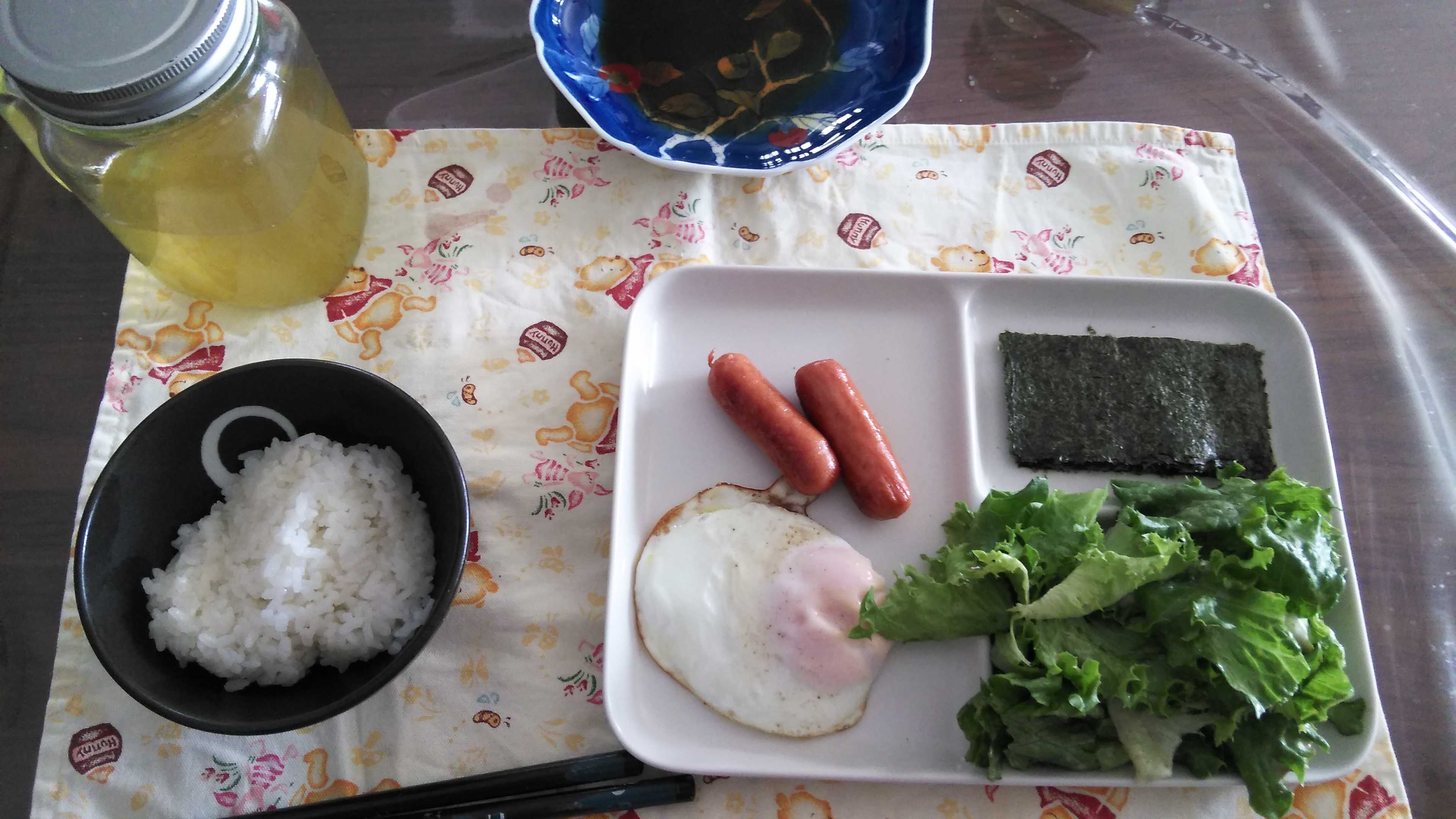 朝食→サラダ、ウィンナー2本、目玉焼き、焼きのり、ご飯、お茶朝食後→カフェオレ昼食→サラダ、りんごジャムヨーグルト、チーズハムトースト、豆乳ココア夕食→サラダ、アスパラガスの胡麻和え、豚肉のビネガー風味、油揚げの味噌汁、ご飯夕食後→コーヒー