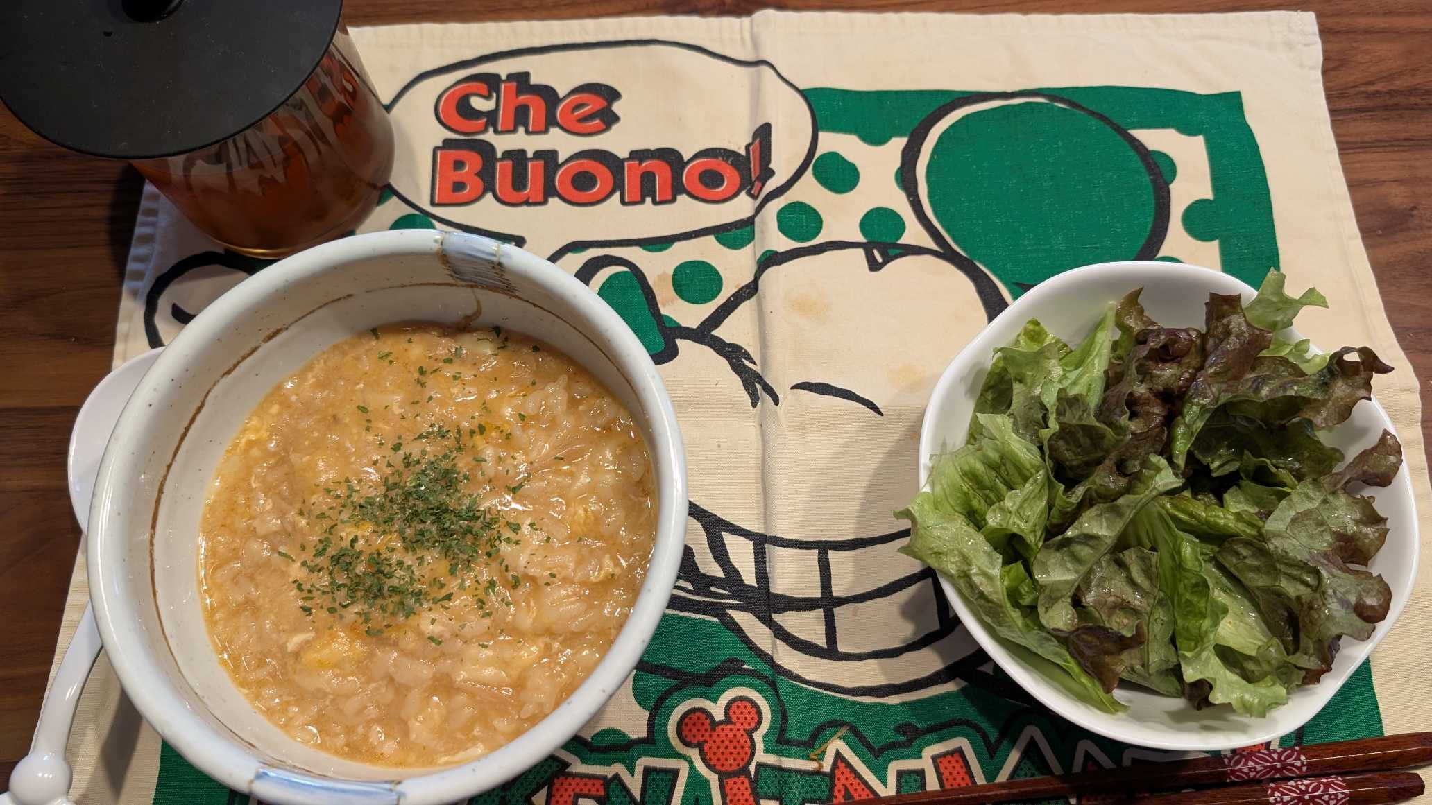 朝食→サラダ、キムチチーズ雑炊、ルイボスティー朝食後→コーヒー昼食→サラダ、白桃ジャムヨーグルト、チーズハムトースト、豆乳ココア夕食→サラダ、大根とツナの煮物、キャベツの肉味噌炒め、ご飯、ニラと玉子の味噌汁、ルイボスティー