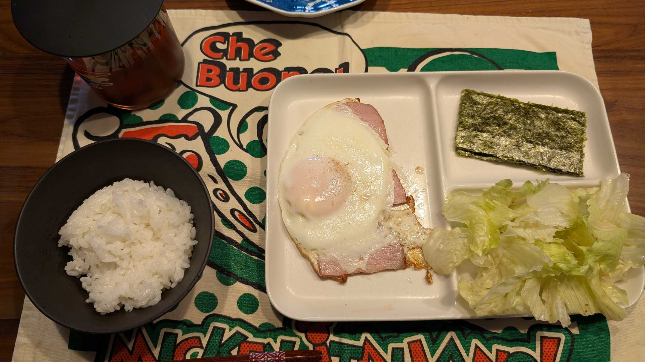 朝食→サラダ、ハムエッグ、焼きのり、ご飯、ルイボスティー朝食後→コーヒー昼食→サラダ、白桃ジャムヨーグルト、チーズハムトースト、牛乳夕食→サラダ、厚揚げ1/2、水餃子、ご飯、茄子の味噌汁、ルイボスティー