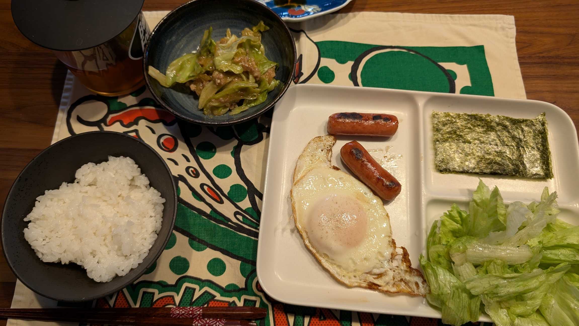 朝食→サラダ、ウィンナー3本、目玉焼き、焼きのり、ご飯、ルイボスティー朝食後→コーヒー昼食→サラダ、イチゴジャムヨーグルト、ツナチーズトースト、牛乳夕食→サラダ、厚揚げ1/2、生姜焼き、ご飯、キャベツの味噌汁、ルイボスティー