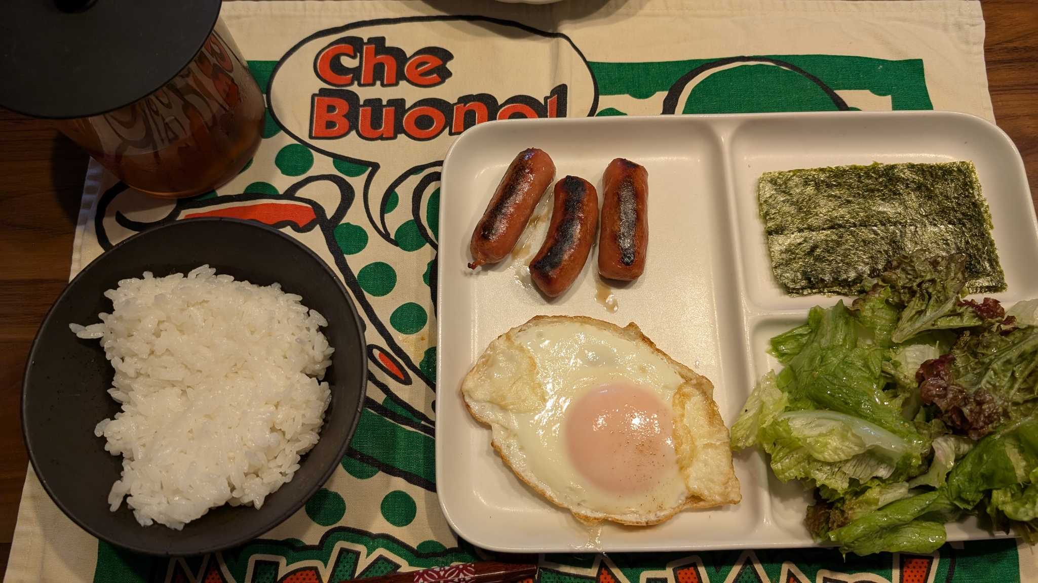 朝食→サラダ、ウィンナー3本、目玉焼き、焼きのり、ご飯、ルイボスティー朝食後→コーヒー昼食→サラダ、マーマレードジャムヨーグルト、明星・Netflix ブラック豚骨まぜそば、ルイボスティー夕食→サラダ、ささみの青のりまぶし、にらともやしのピリ辛ナムル、ご飯、ほうれん草の味噌汁、ルイボスティー
