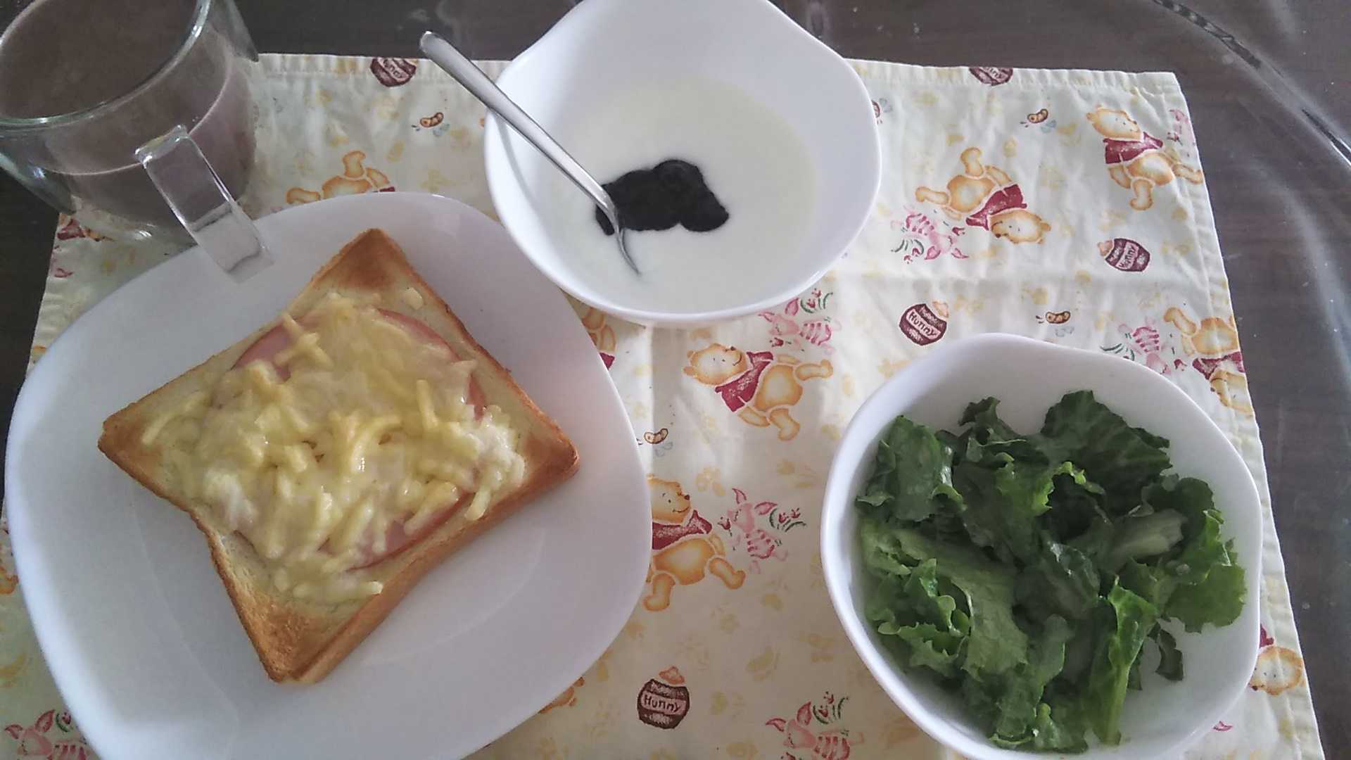 昼食→サラダ、ブルーベリージャムヨーグルト、チーズハムトースト、豆乳ココア