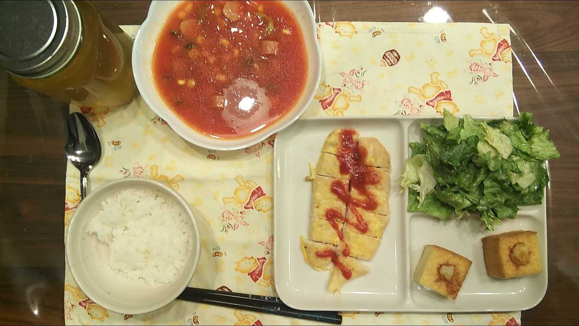 夕食→サラダ、厚揚げ豆腐、ささみのピカタ、ミネストローネ風スープ、ご飯、お茶