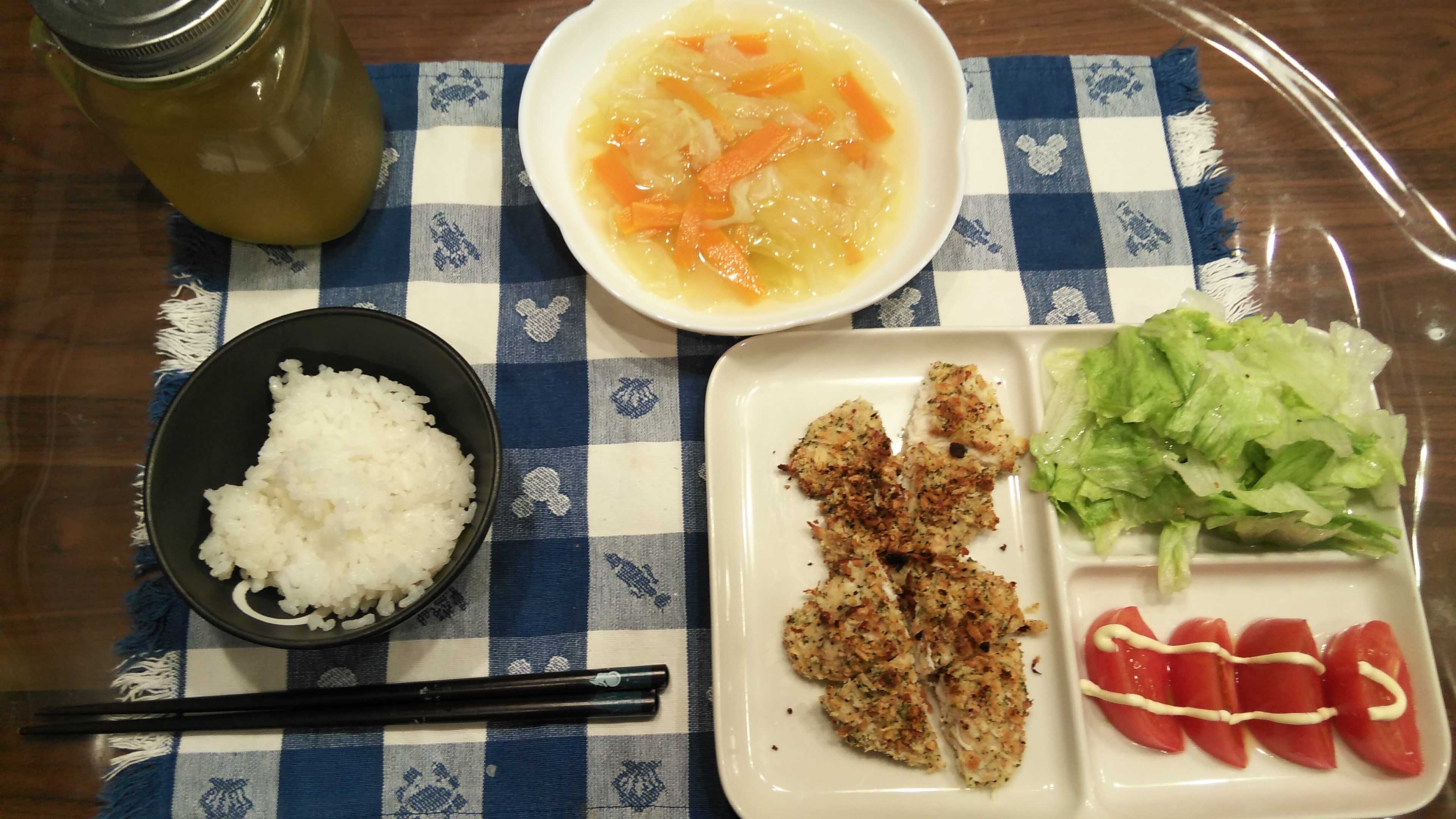 夕食→トマト、サラダ、鶏肉のアーモンド入りパン粉焼き、野菜のスープ、ご飯、お茶
