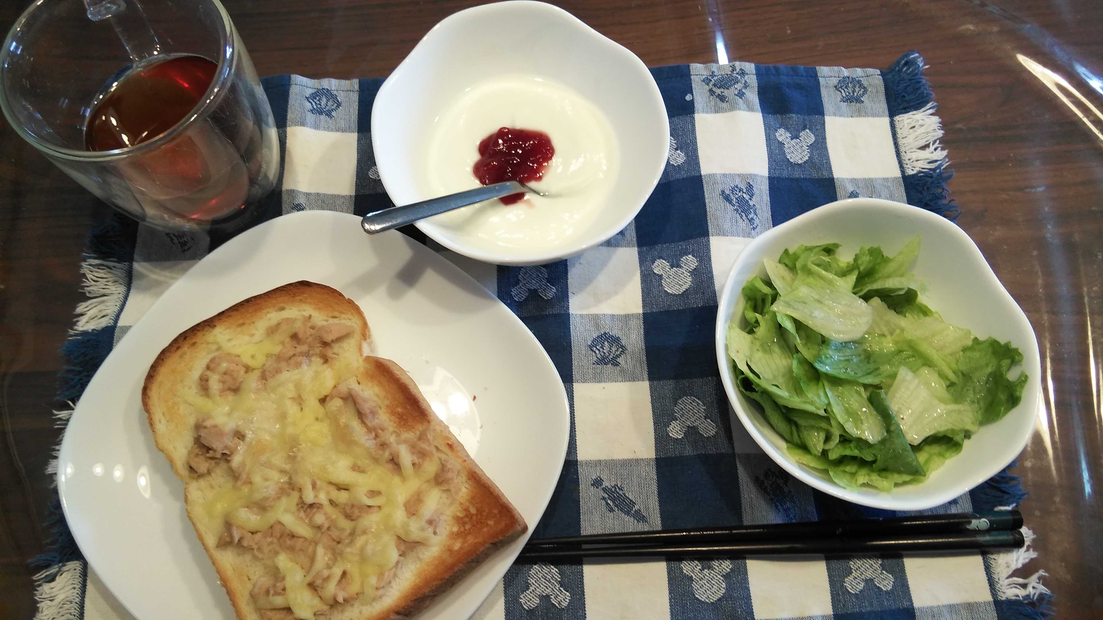 昼食→サラダ、イチゴジャムヨーグルト、ツナチーズトースト、アイスティ