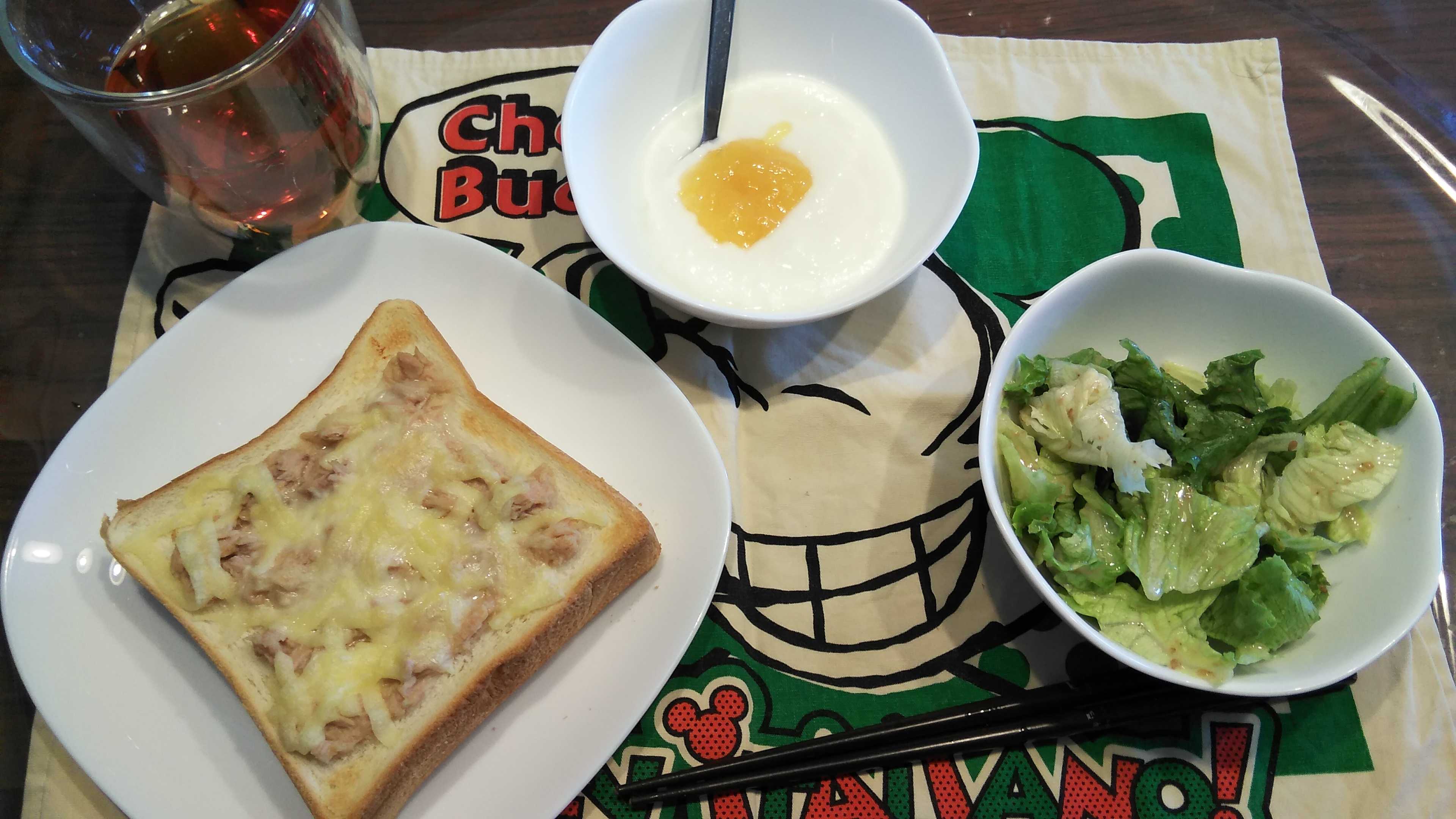 昼食→サラダ、オレンジジャムヨーグルト、ツナチーズトースト、アイスティ