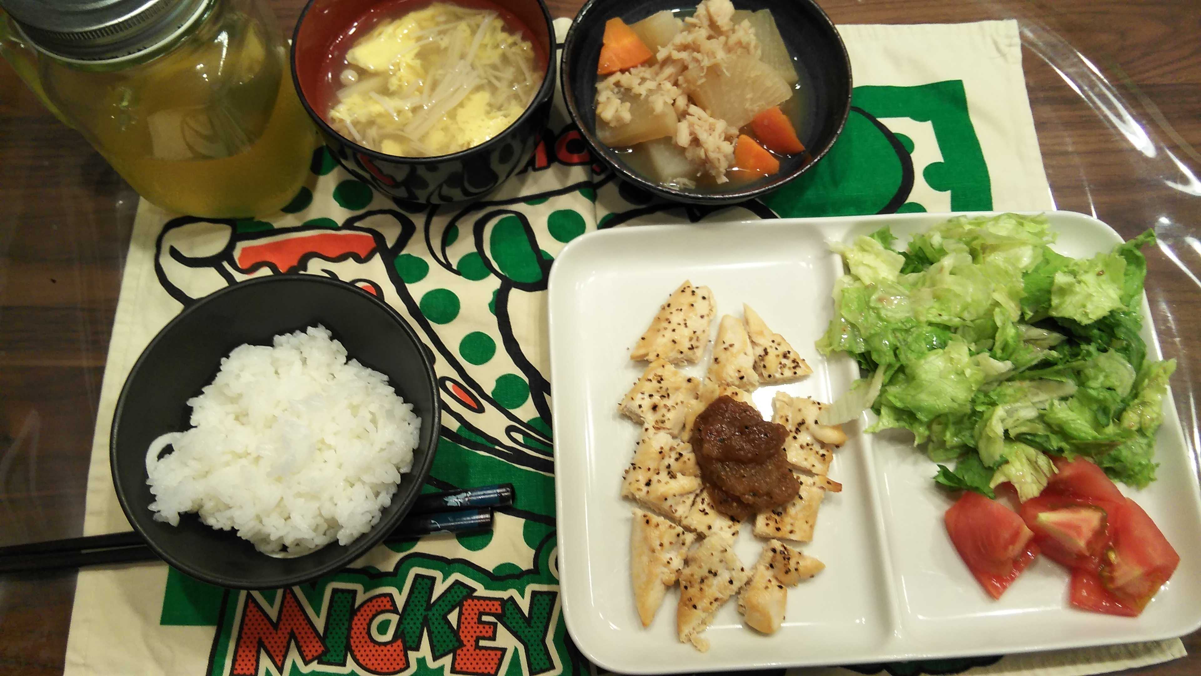 夕食→トマト、サラダ、ささみの照り焼きオニオンソース、大根と人参の煮物、エノキダケと卵の中華スープ、ご飯、お茶