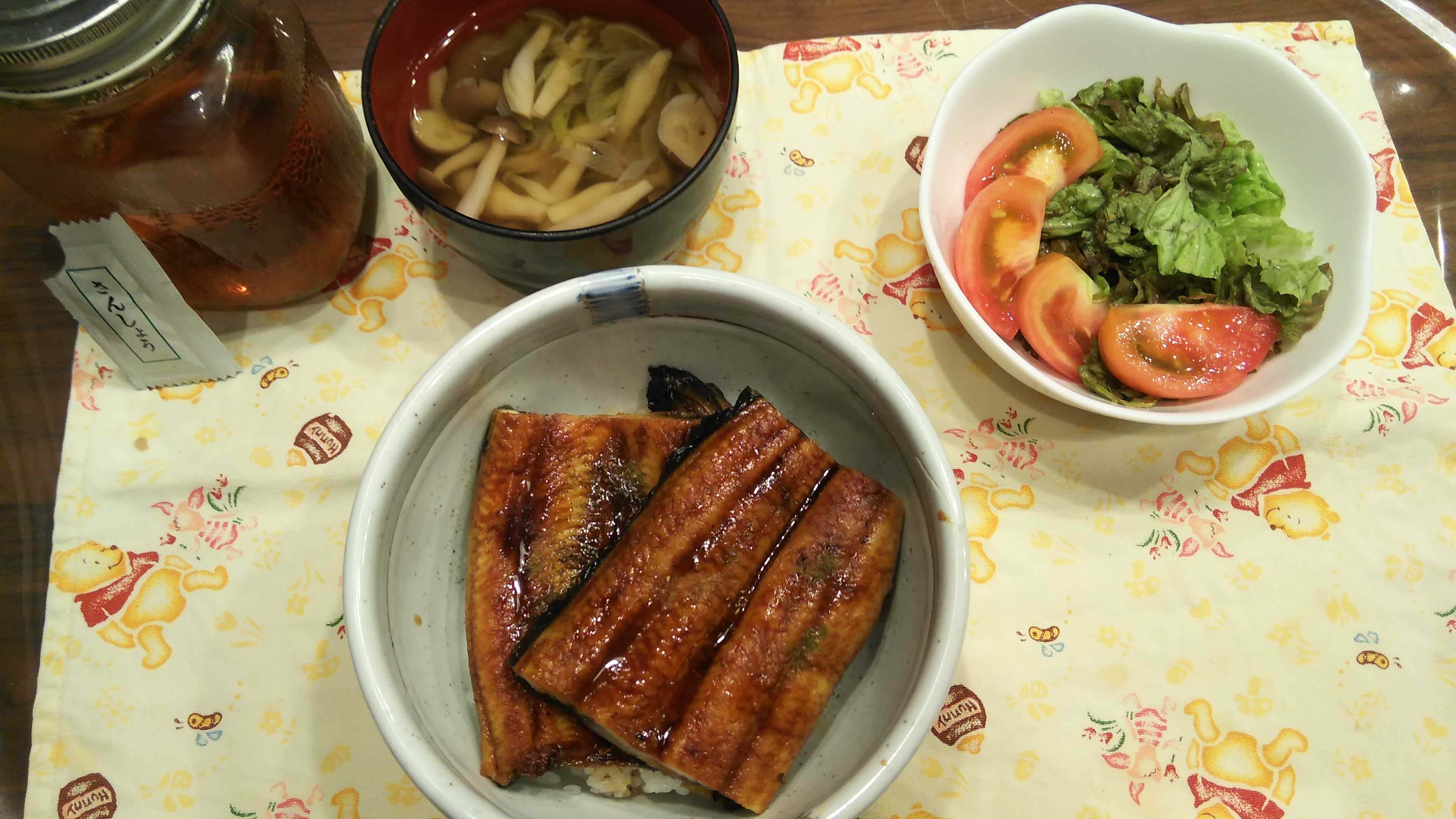 夕食→トマト、うな丼、しめじのすまし汁、紅茶