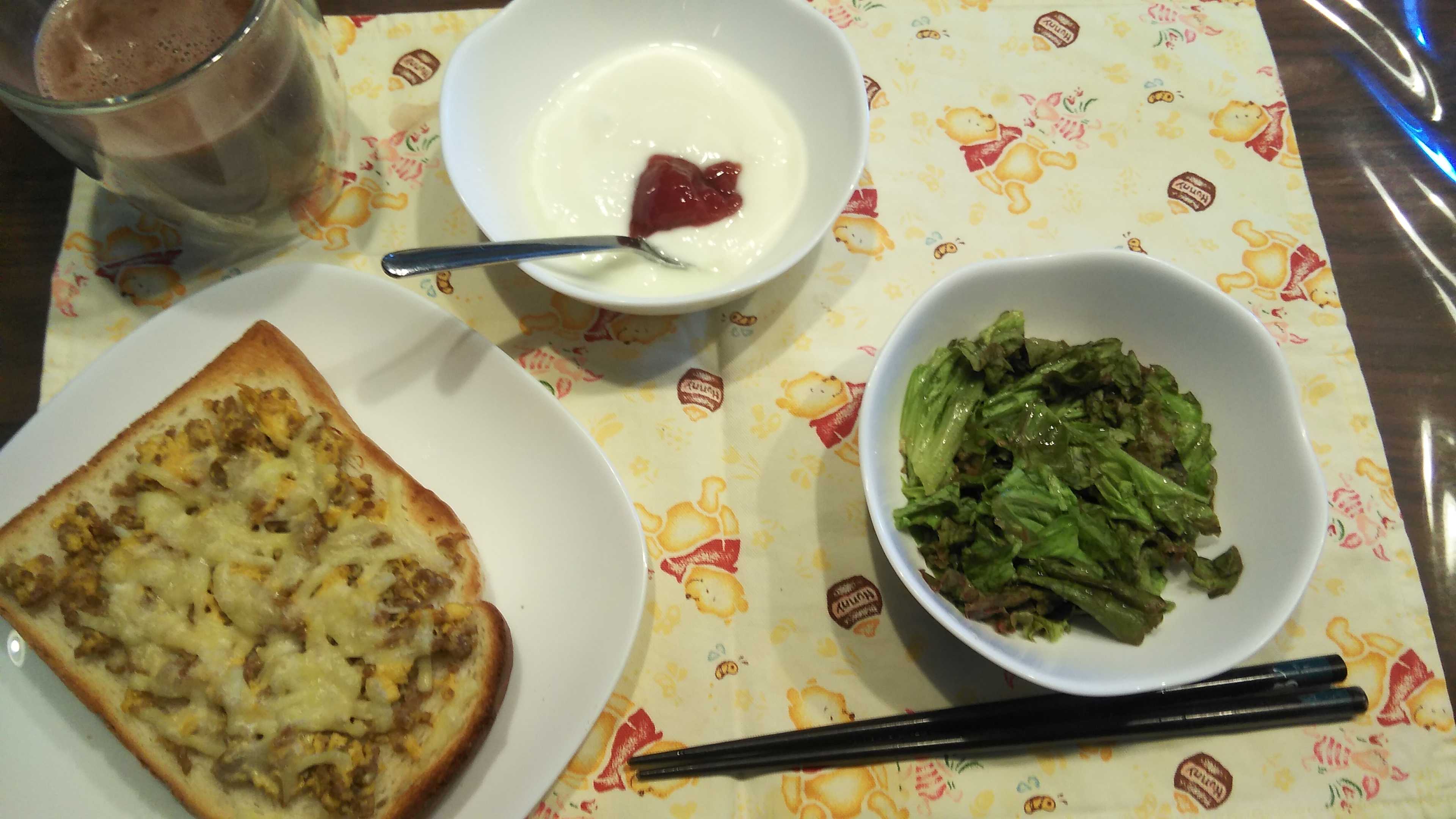 昼食→サラダ、イチゴジャムヨーグルト、卵ミンチトースト、豆乳ココア