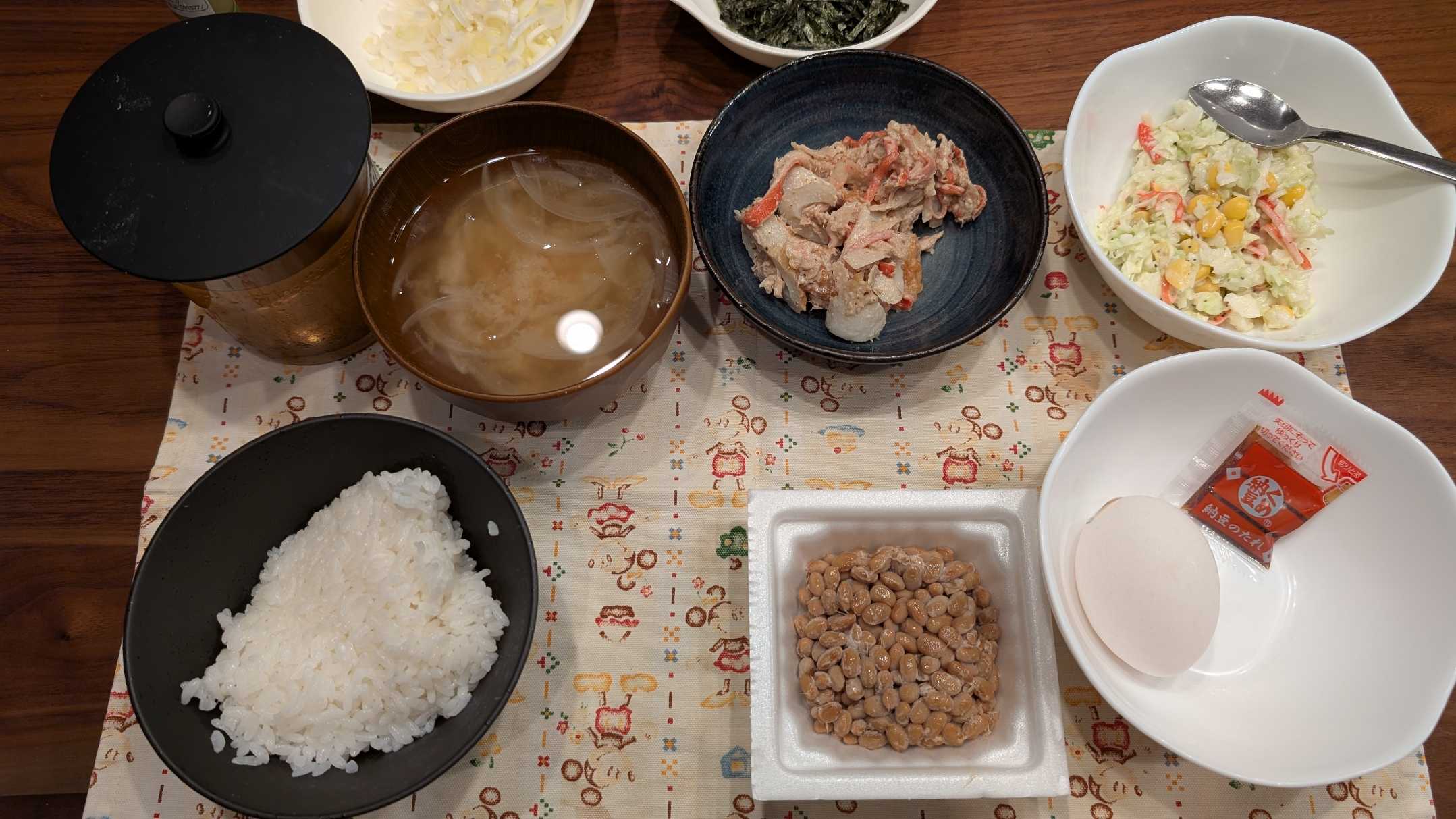 夕食→カニカマサラダ、竹輪とツナの胡麻マヨ和え、わさび卵納豆、ご飯、玉ねぎの味噌汁、ハト麦茶