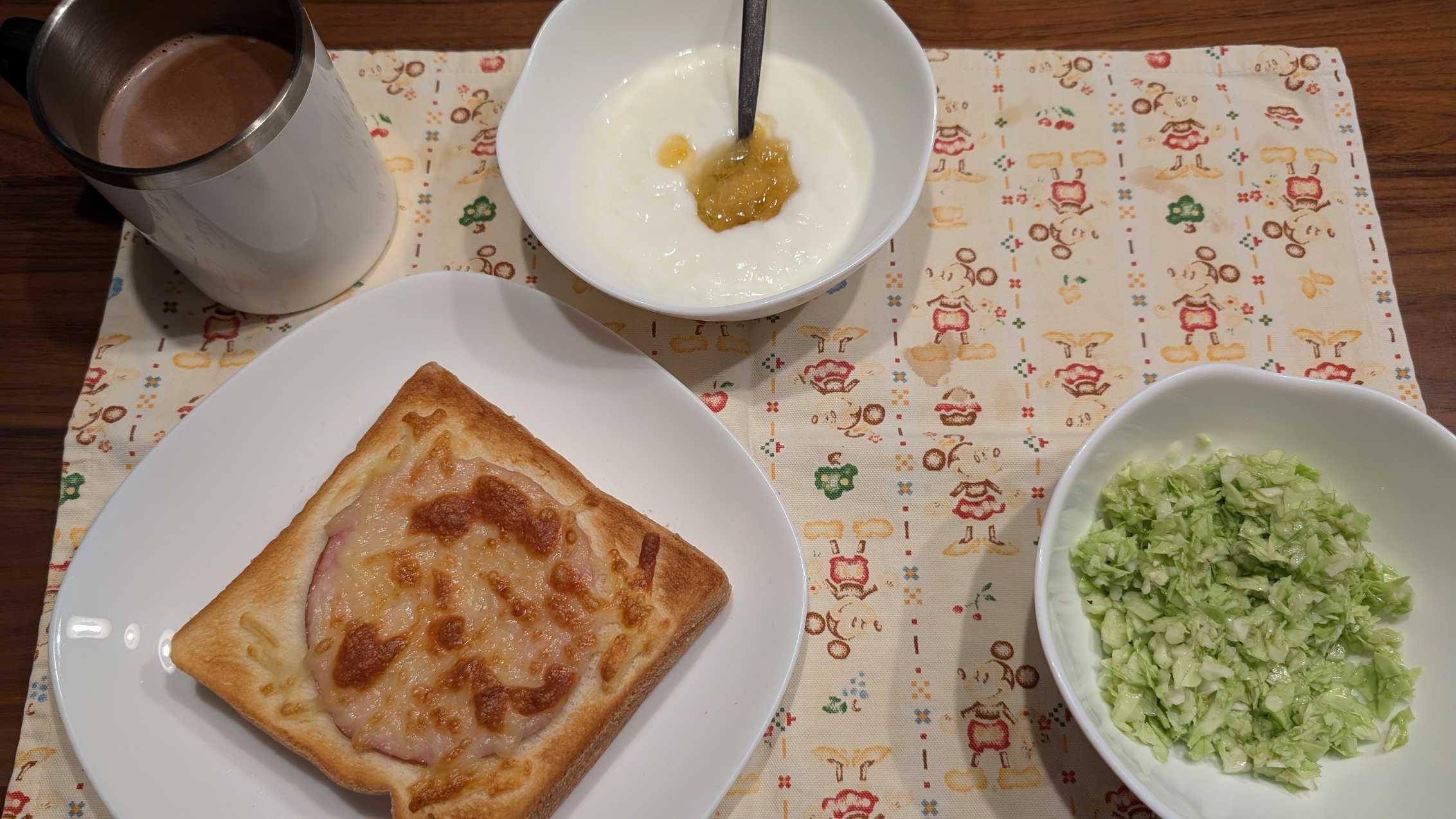 昼食→サラダ、マーマレードジャムヨーグルト、チーズハムトースト、豆乳ココア