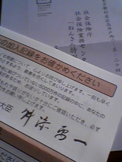 今日こんな郵便物が届きました。そう、これは私の年金があの消えた年金5000万件のうちの1件だったというお知らせだったのです。最初の勤め先の厚生年金の記録がすっぽりなくなっていました。年金問題に関しては非常に関心があって、今後どうなるのだろうかと心配していたのですが…まさか自分の記録が消えているとは思いもしませんでした。まあきちんとお知らせが来たので良かったけど、年金を実際に受け取る頃にはこの制度いったいどうなっている事でしょう?
