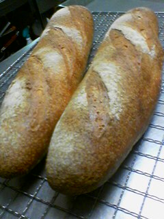 今回は天然酵母でフランスパンに挑戦しました。なかなか良い焼き上がりです。でも生地づくりから焼き上がりまで11時間ほどかかっています。天然酵母のパンはじっくりと時間をかけて発酵させればさせるほど上手に焼ける気がします。焼き上がったのは夜の9時。焼き立てを夕飯に頂きました。焼き立てフランスパンにサラダ、魚介のトマトクリームスープ。そして白ワイン。今日の夕飯は一人で簡単にすませるはずだったのに、思わぬところでご馳走になりました。肝心のフランスパンのお味ですが、これが実に旨かった。パリッと焼けた皮の部分とその周辺がモチモチ感たっぷりで、こんなに食感の良いフランスパンは久しぶりに食べました。天然酵母パン、はまりそうです。