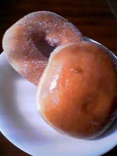 初めてあの噂のクリスピークリームドーナツを食べました。自分であの長蛇の列に並んで買う事は絶対にありえないと思っていたので、いただき物ですが思いがけず食べる事ができました。どんな種類のドーナツがあるのか分からないけど、私がいただいたのはこの2つ。中にレモンクリームが入った丸やつとお砂糖がまぶしてあるリング型のやつ。食べた感想はと言うと…とにかく甘味が強い。香料がたっぷり使ってある。といった感じでしょうか?まあ人によって好みもあるから何とも言えませんが、ナチュラル派の私にはちょっと強すぎる味だったかな?