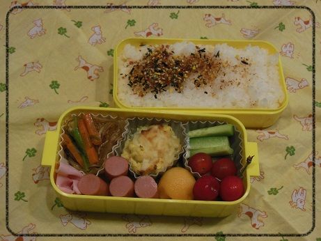 上の娘が部活でお弁当持ちだったので久しぶりにお弁当を作りました!ホールリハーサルだったのでいつもと気分を変えて違うお弁当箱にしてみました~♪今日のお弁当の内容は、 2色そぼろご飯、豚肉にんじん巻、ミートボール(市販)、ブロッコリー、 パスタサラダ、ちくわinきゅうり、ミニトマト、ハム&チーズのお花 です。