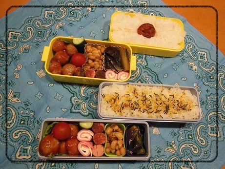 ★今日のお弁当は、ミートボール(市販)、ぐるぐるハムチーズ、ミニトマト、キュウリ、豆の煮物(市販)、ナスの揚げびたし です。