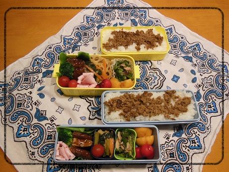 今日のお弁当は、ブロッコリー、ハム、ハンバーグ(市販)、ミニトマト、金平レンコン、無限ピーマン、ビワ、サクランボ です。ご飯にかけたのは昨晩の『ひき肉大根』ののこりのひき肉ですw