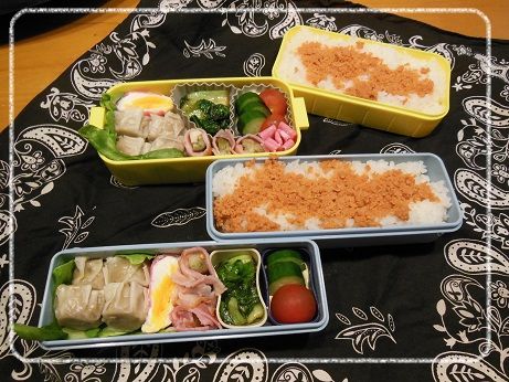★今日のお弁当は、シュウマイ(市販)、ハムエッグ、ナス巻ベーコン、チンゲン菜炒めキュウリ、ミニトマトです。寝坊しました。ヤバかった!!上の娘の朝練がない日で助かりました~!