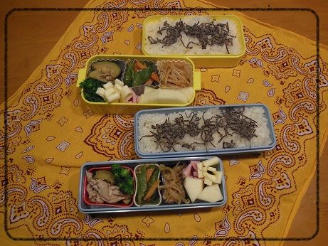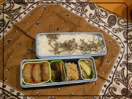 今日は上の娘が部活でお弁当ありでした。コンクールに向けてがんばれ!おかずは、ハンバーグ(市販)、ナス揚げびたし、切り干し大根の煮物、春雨サラダ です。