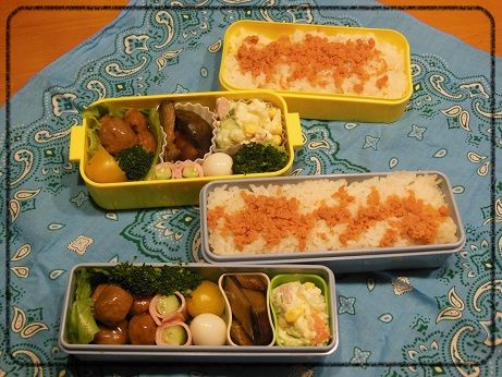 今日のおかずは、ミートボール(市販)、ブロッコリー、ミニトマト(黄)、ハムのキュウリ巻、ウズラの卵、ナスの揚げびたし、ポテトサラダ です。