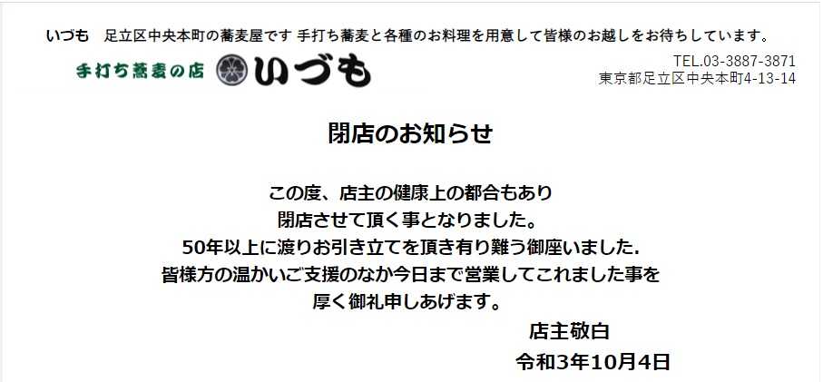【手打蕎麦処 いづも】 足立区中央本町4-13-14  ホームページ
