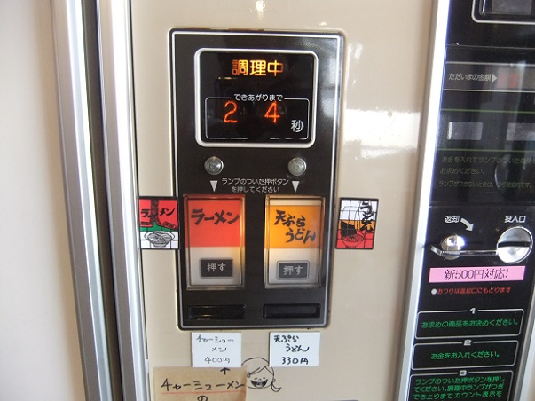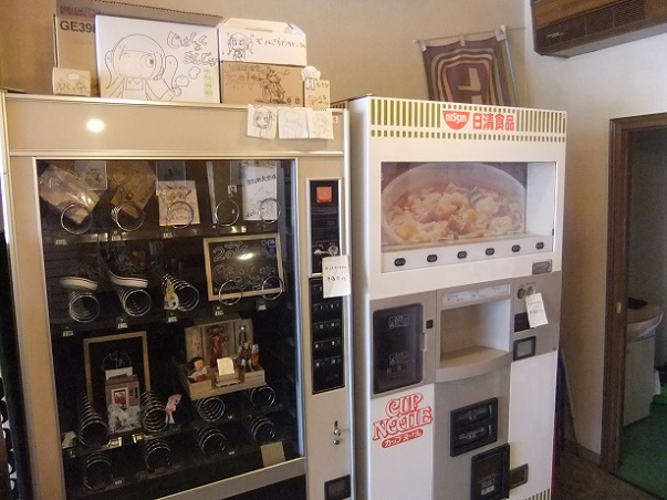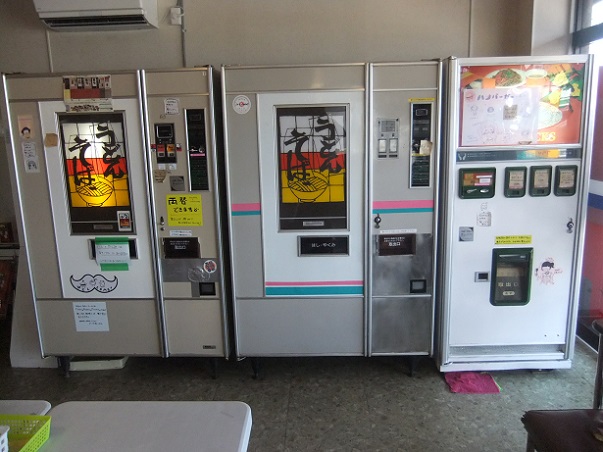 私の目当ては、もちろん、富士電機めん類自販機。2台あるものの、古いからね。メンテナンスができないのか、1台は非稼働。右にあるのが星崎電機ハンバーガ自販機。