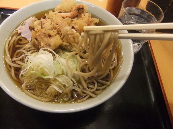 自家製麺の5割そば。生麺茹でたてでしこしこで安心の美味しさ。そばつゆは、本鰹節、宗田鰹節、鯖節でとった本格派だそうで、こちらもまずまずの美味しさ。ゲソ天もまずまず。