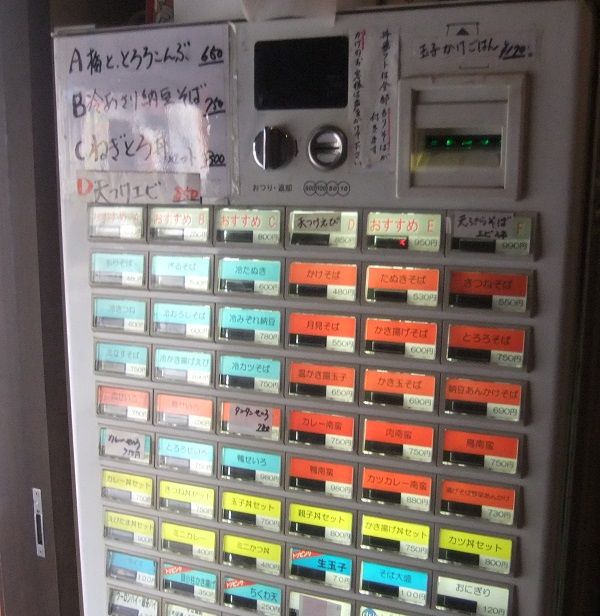 店内に入ってすぐの券売機で食券を買って渡す。特に気になるメニューがなかったので「路麺の基本」と位置付けられる『かき揚そば』\600にしよう。これも2年前より\100アップみたい。
