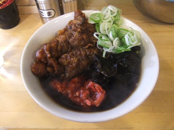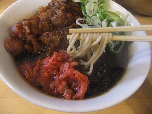 うわぁ~、今日のつゆはいつもよりダークだね。紅生姜天の赤が映えるかと思ったら全体的に暗めだね。そして、いつも以上の辛汁。紅生姜天も辛い。