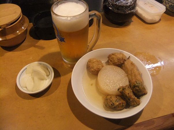 生ビール\400とおでん(大根\100、げそ\150、ピリ辛ボール\150、すじ\200)で\1,000。