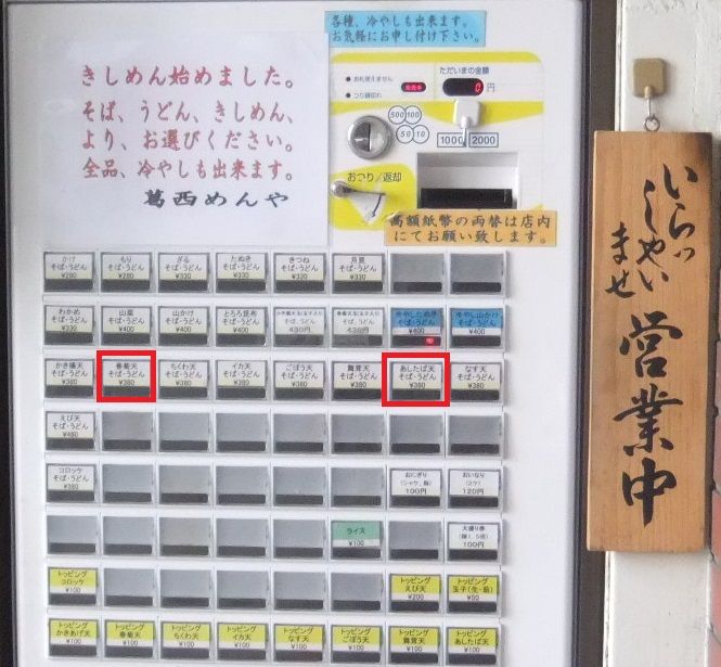 店頭の券売機。明日葉天も考えたが、前回いただいたので春菊天にしよう。
