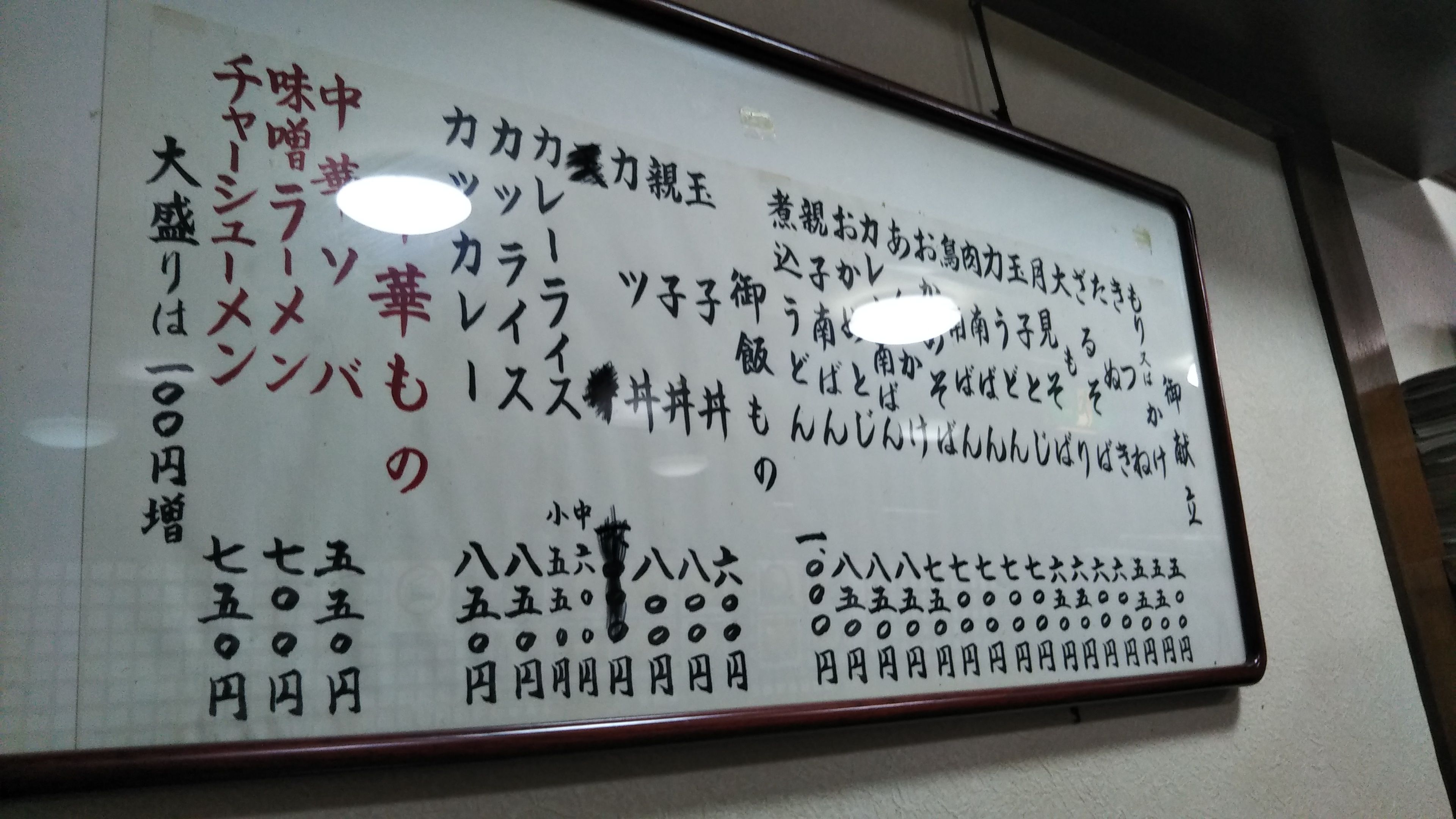 お品書き。別に壁に立派な木製のお品書きもある。これらには店頭の写真メニューは載っていないようだ。
