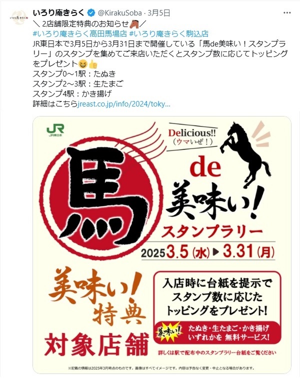 当店は、JR東日本で2025年3月5日から3月31日まで開催している「馬de美味い!スタンプラリー」の対象店舗のひとつ。