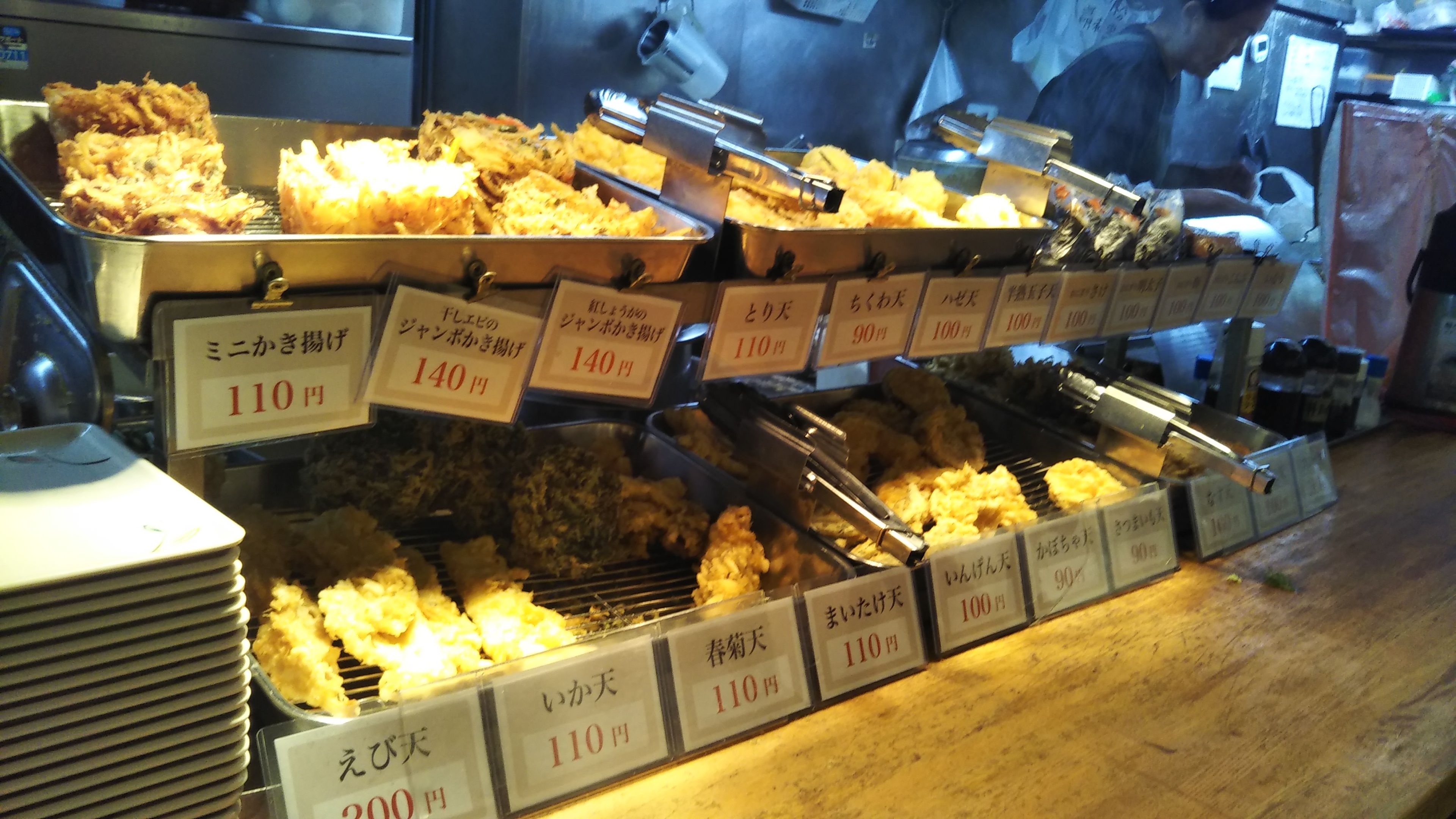 券売機ではなく、口頭注文の さぬきうどん屋方式で麺orレギュラーメニューを注文し、トレイを流して天ぷら類のトッピングを取って会計する。好物の春菊天があったので当初の予定を変更。