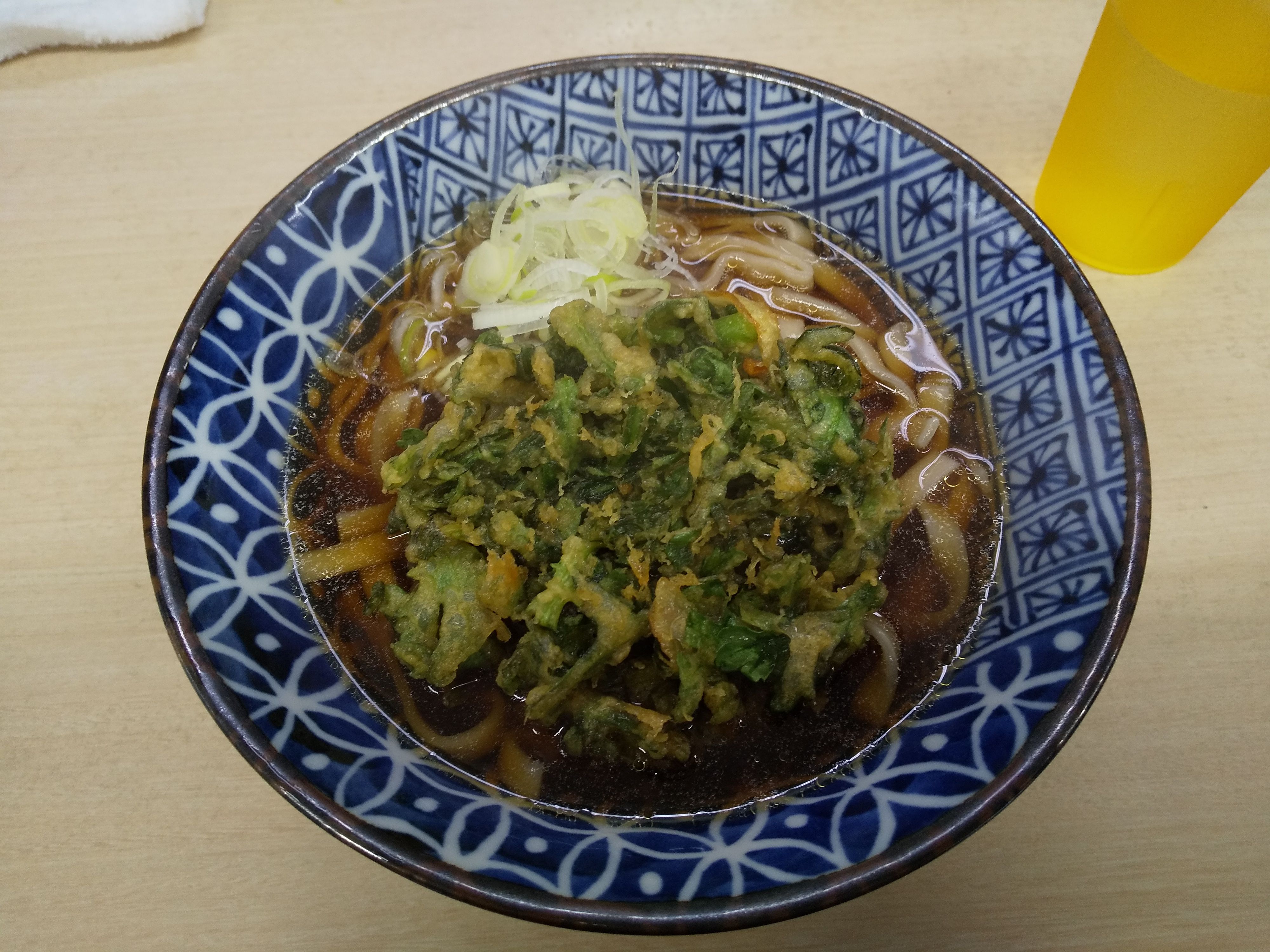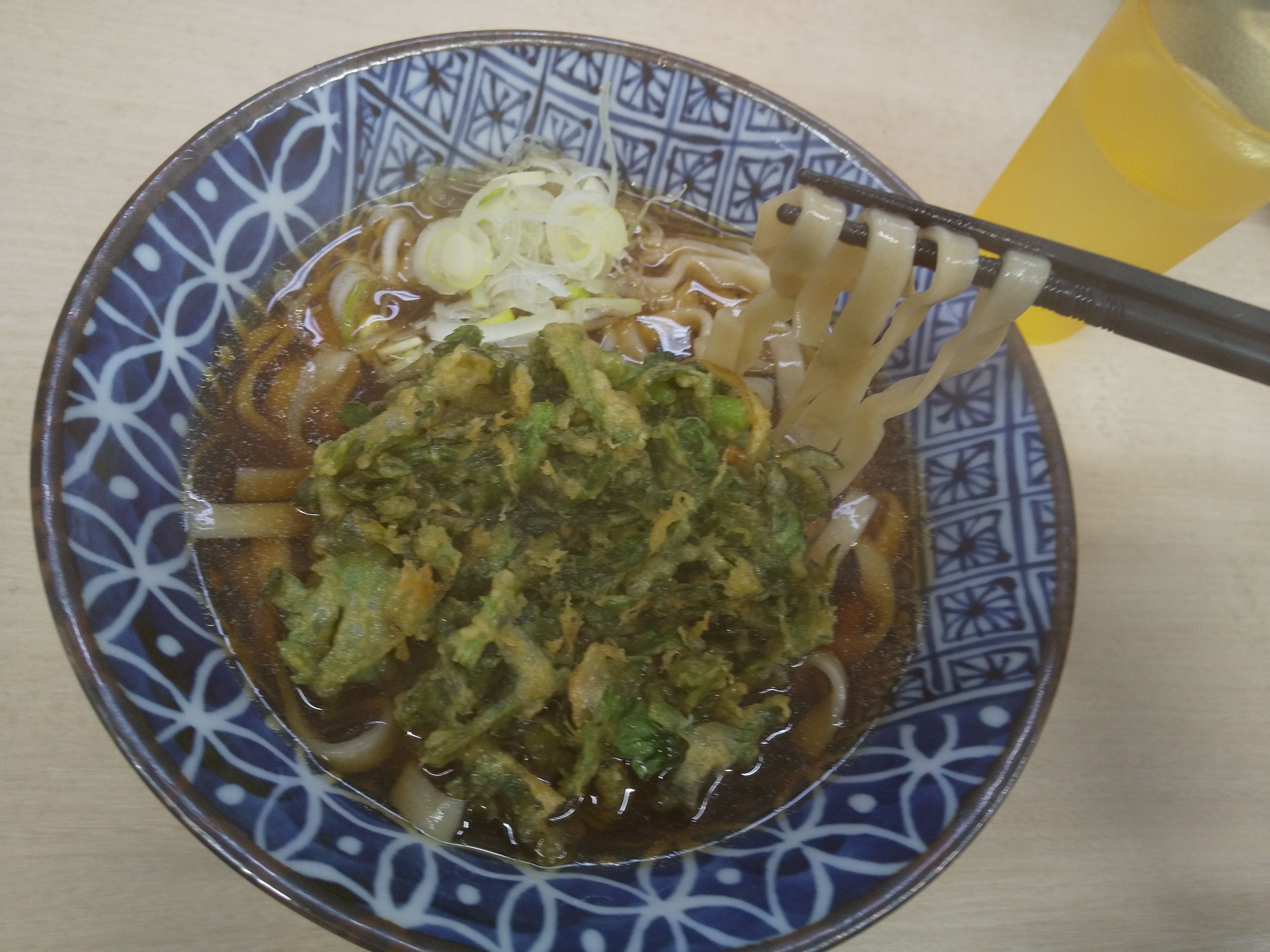 太麺、もっちり感があって美味い。食感が楽しい。春菊天は見た目よりもいいし、つゆも