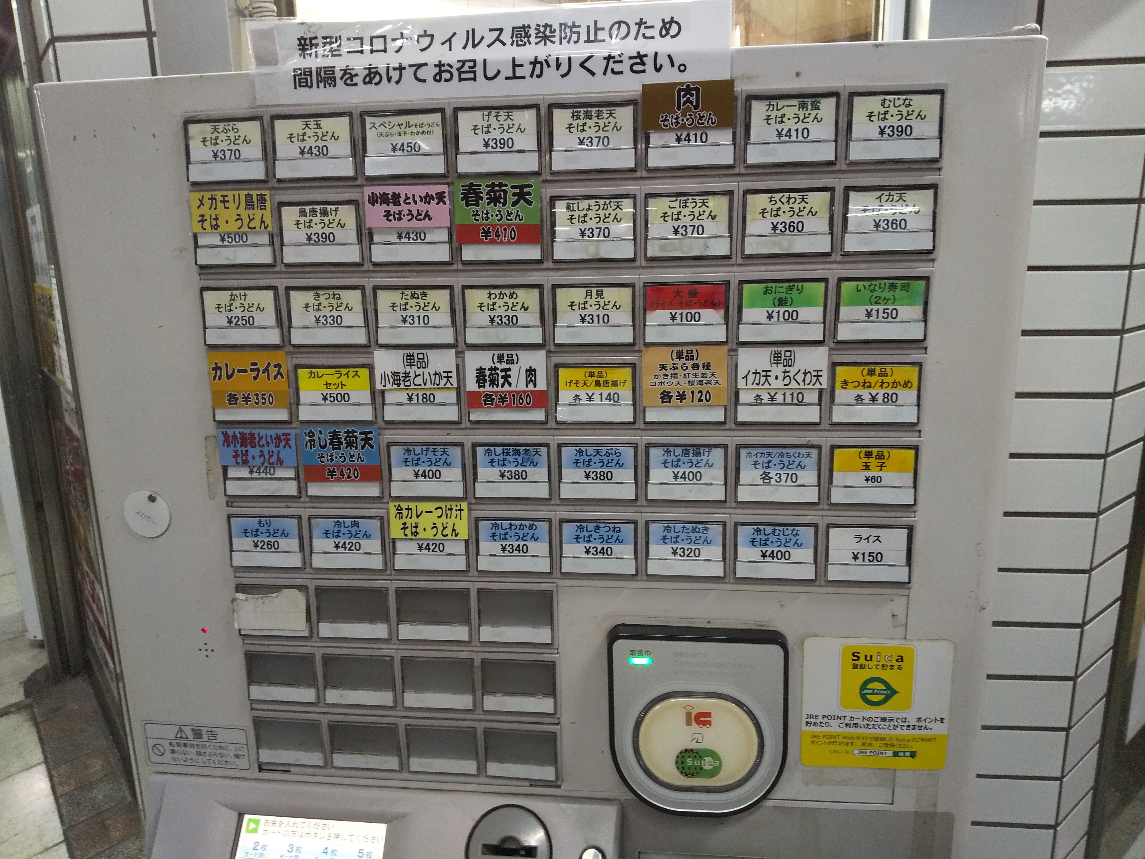 券売機。ボタンの色を見ると『ゲソ天』よりも『肉』『春菊天』あたりを推しているのかな